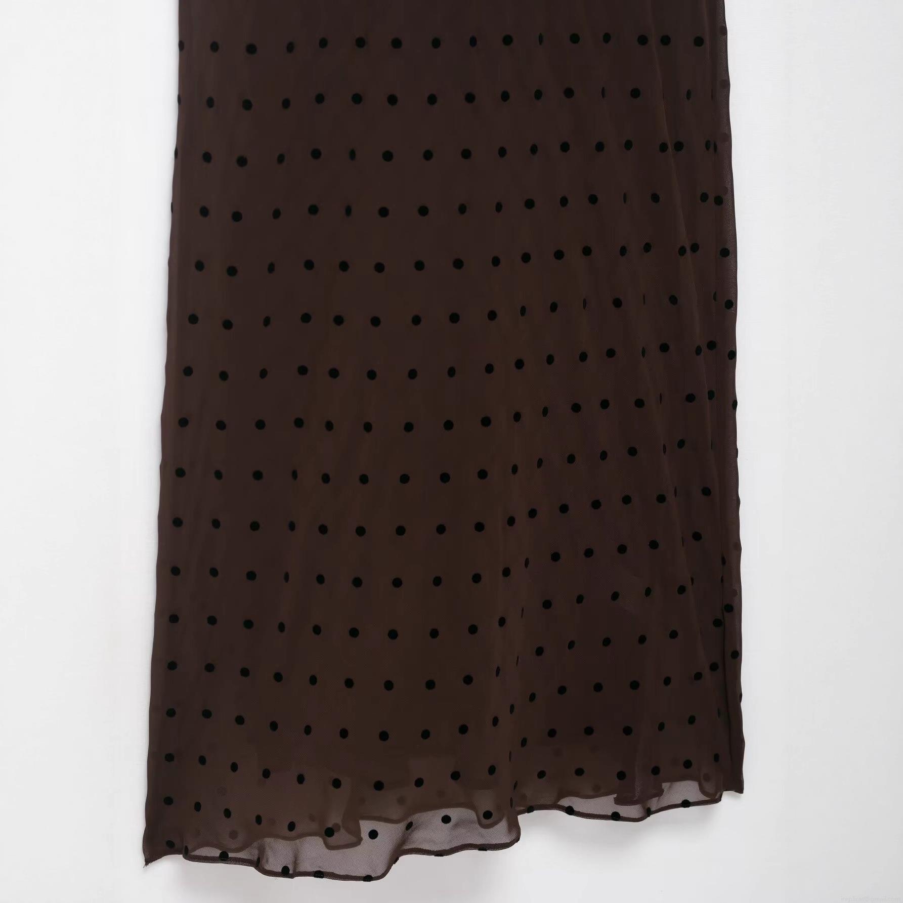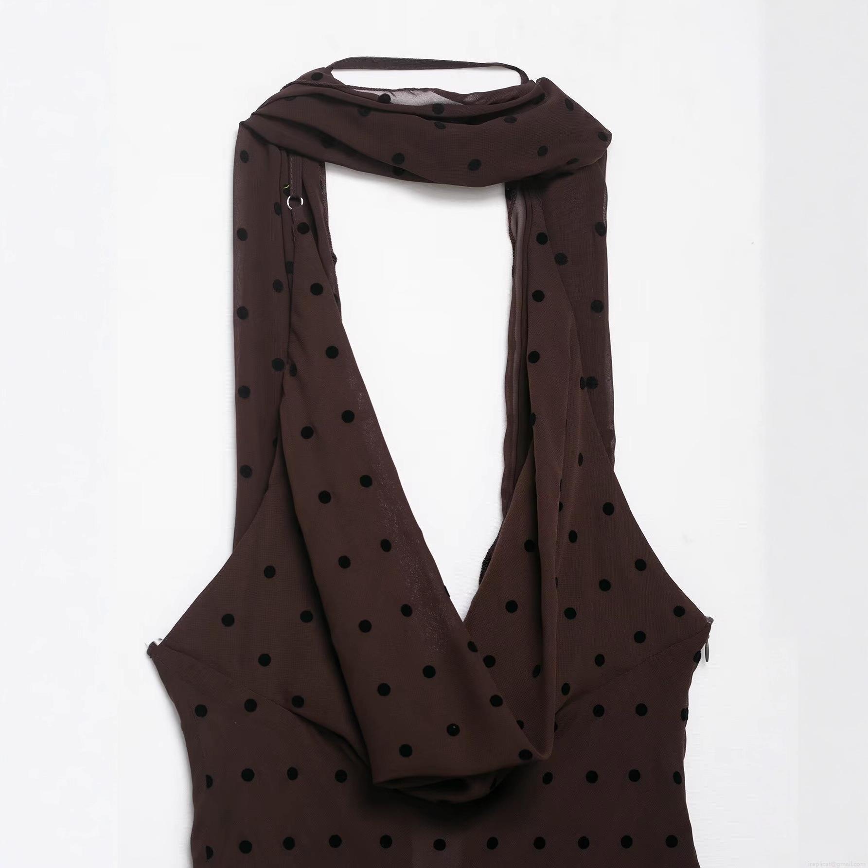 Women Halter Backless Polka Dot Dress French Vintage Sleeveless Scarf Collar Midi Dress Elegant Coffee Brown Polyester Party Sundress Streetwear