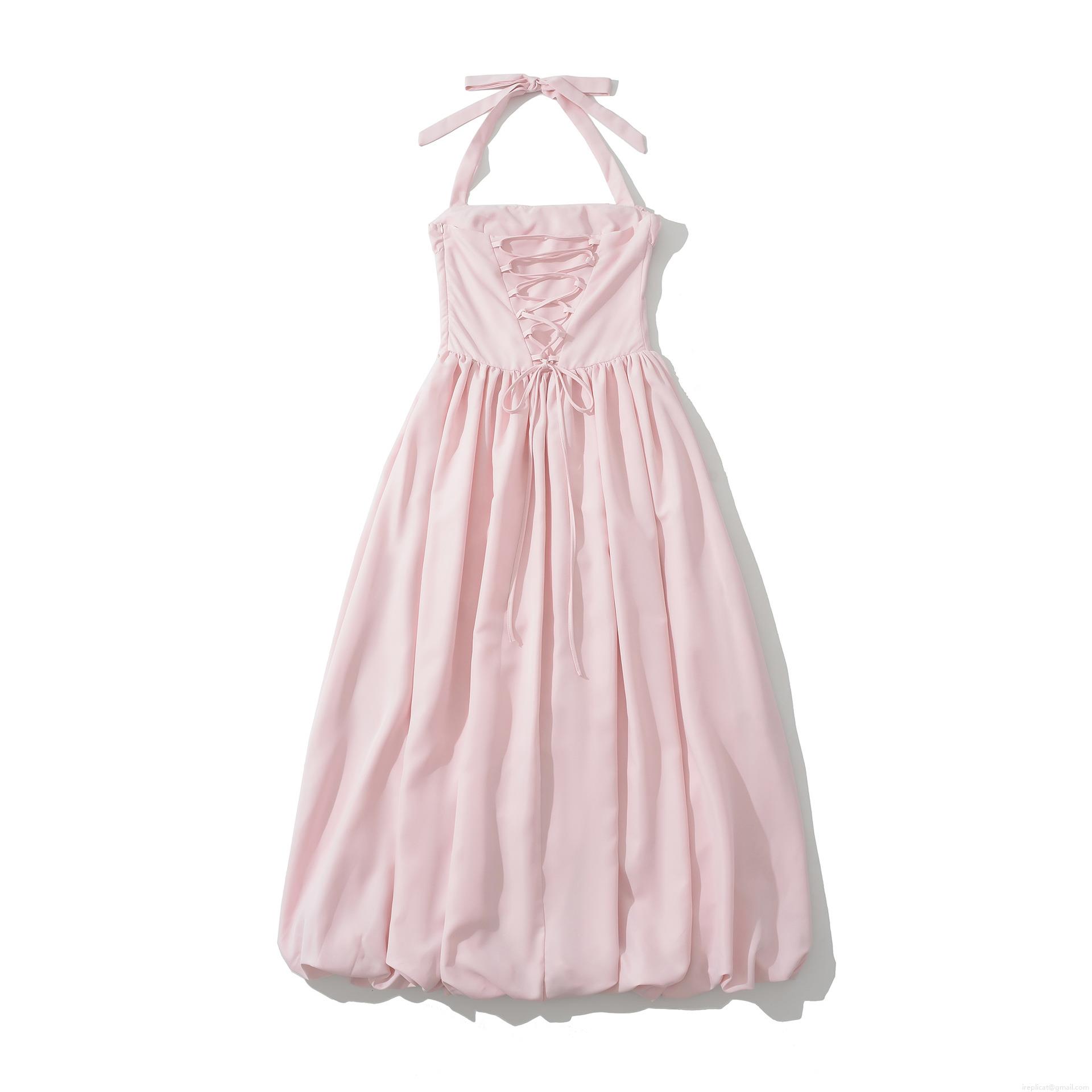 Women Halter Neck Backless Lace-Up Dress Satin Polyester Pleated Bust Irregular Hem Midi Dress Elegant Sexy Backless Party Vacation Dress For Women