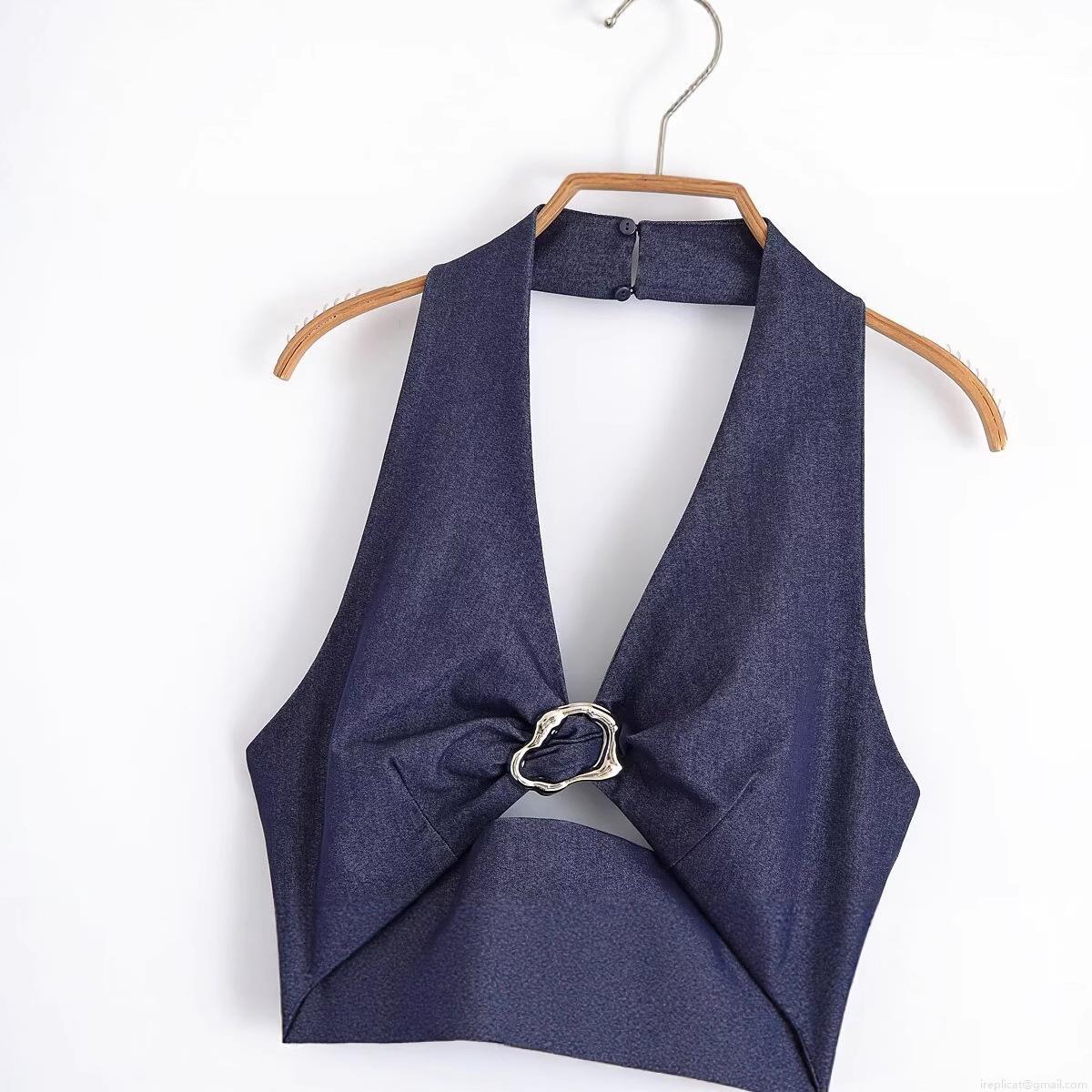 Women Halter Neck Backless Midi Dress Denim Texture Polyester With Irregular Metal Ring Buckle Sexy Slit Hem Party Dress Summer Streetwear