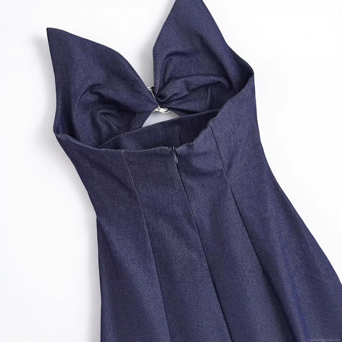 • Women Halter Neck Backless Midi Dress Denim Texture Polyester With Irregular Metal Ring Buckle Sexy Slit Hem Party Dress Summer Streetwear