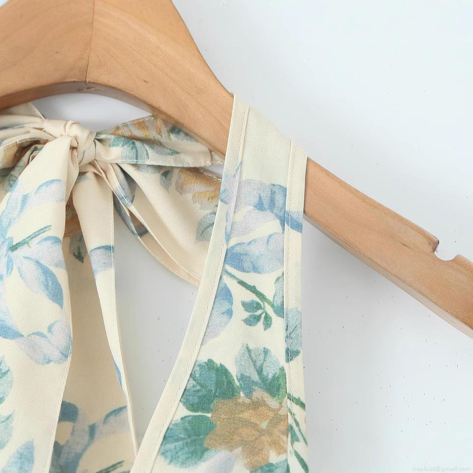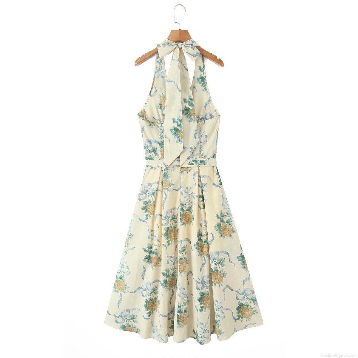 • Women Halter Neck Floral Midi Dress Retro Yellow Rose Ribbon Print Deep V Neck Backless Bow Tie A-Line Cotton Blend Sundress For Summer Vacation Beach Party Streetwear