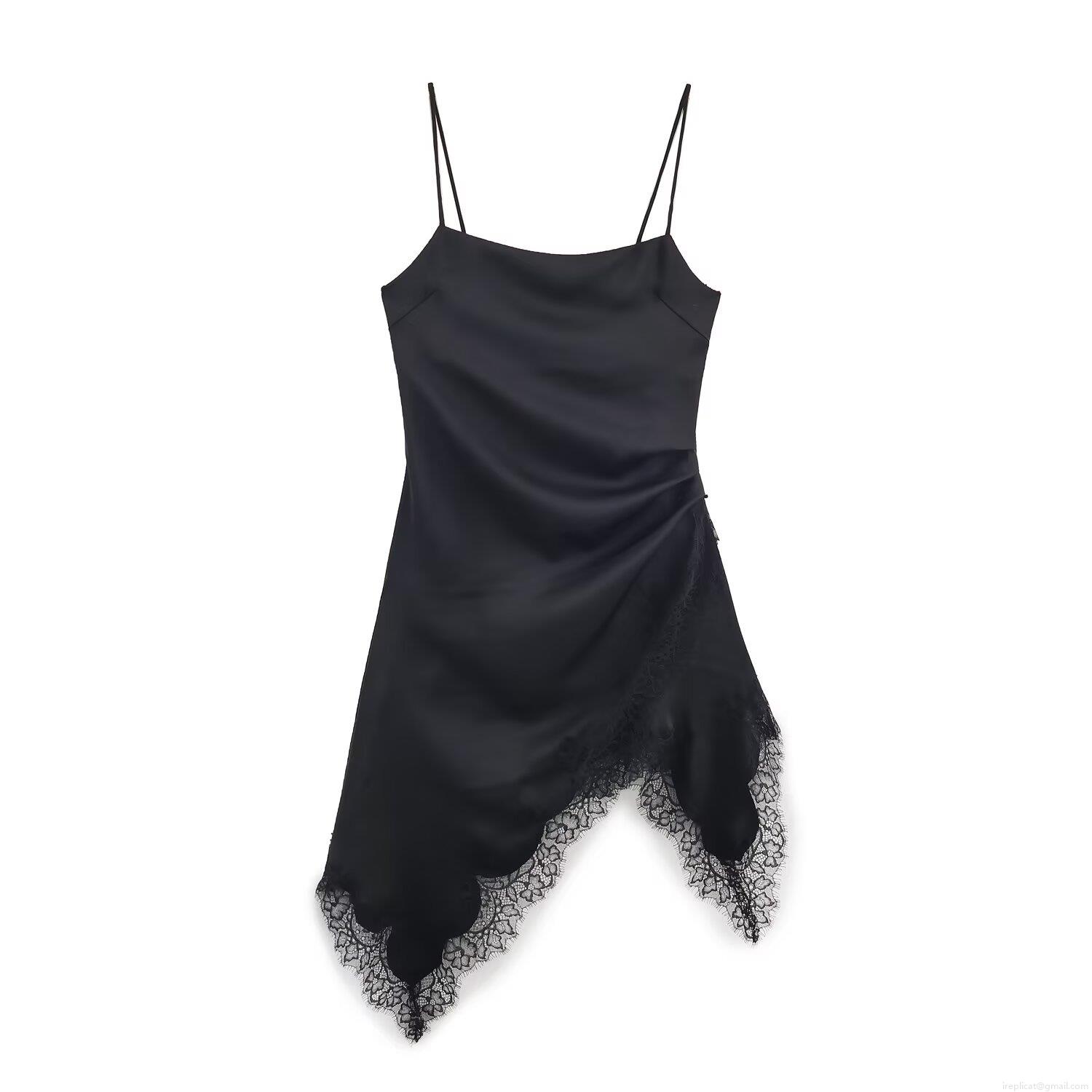 • Women Lace Patchwork Satin Slip Midi Dress Irregular Hem V-Neck Spaghetti Strap Polyester Silk Texture Evening Party Club Wear Sexy Elegant Dress