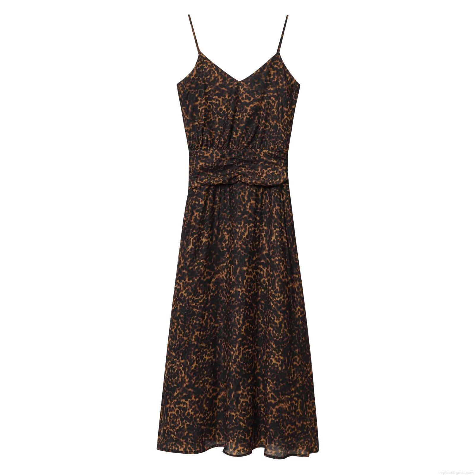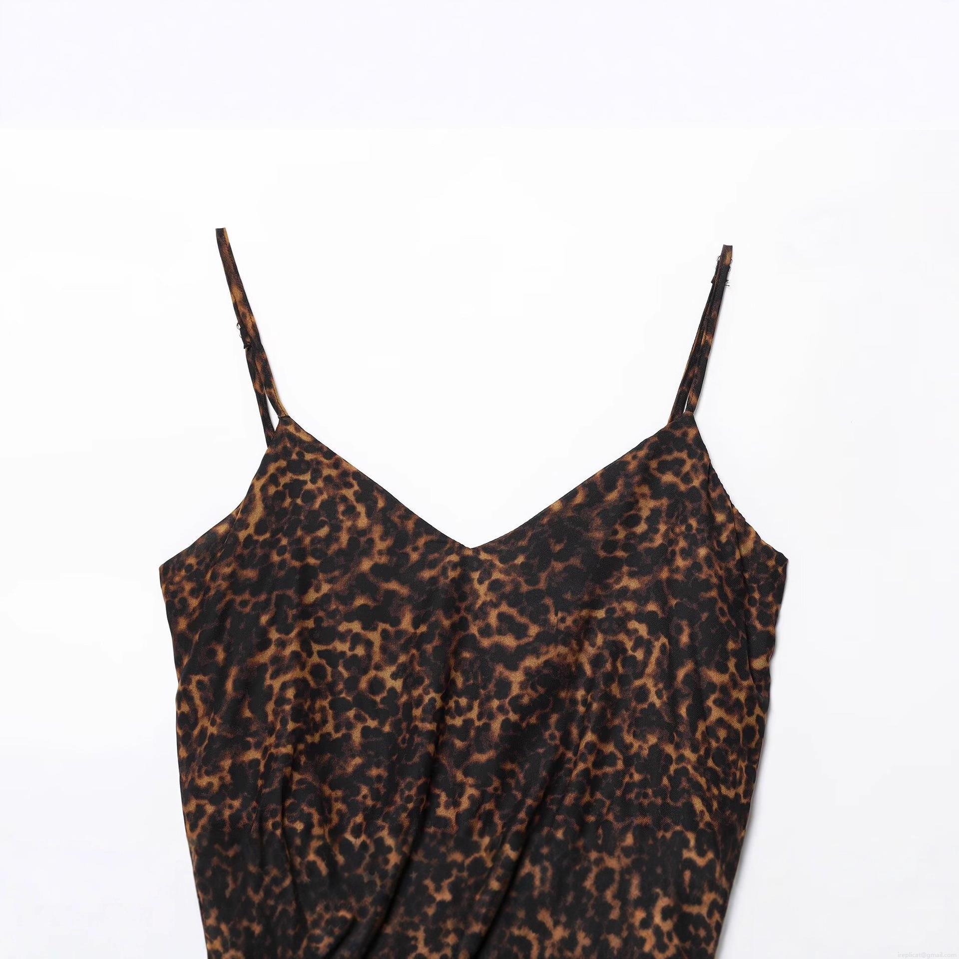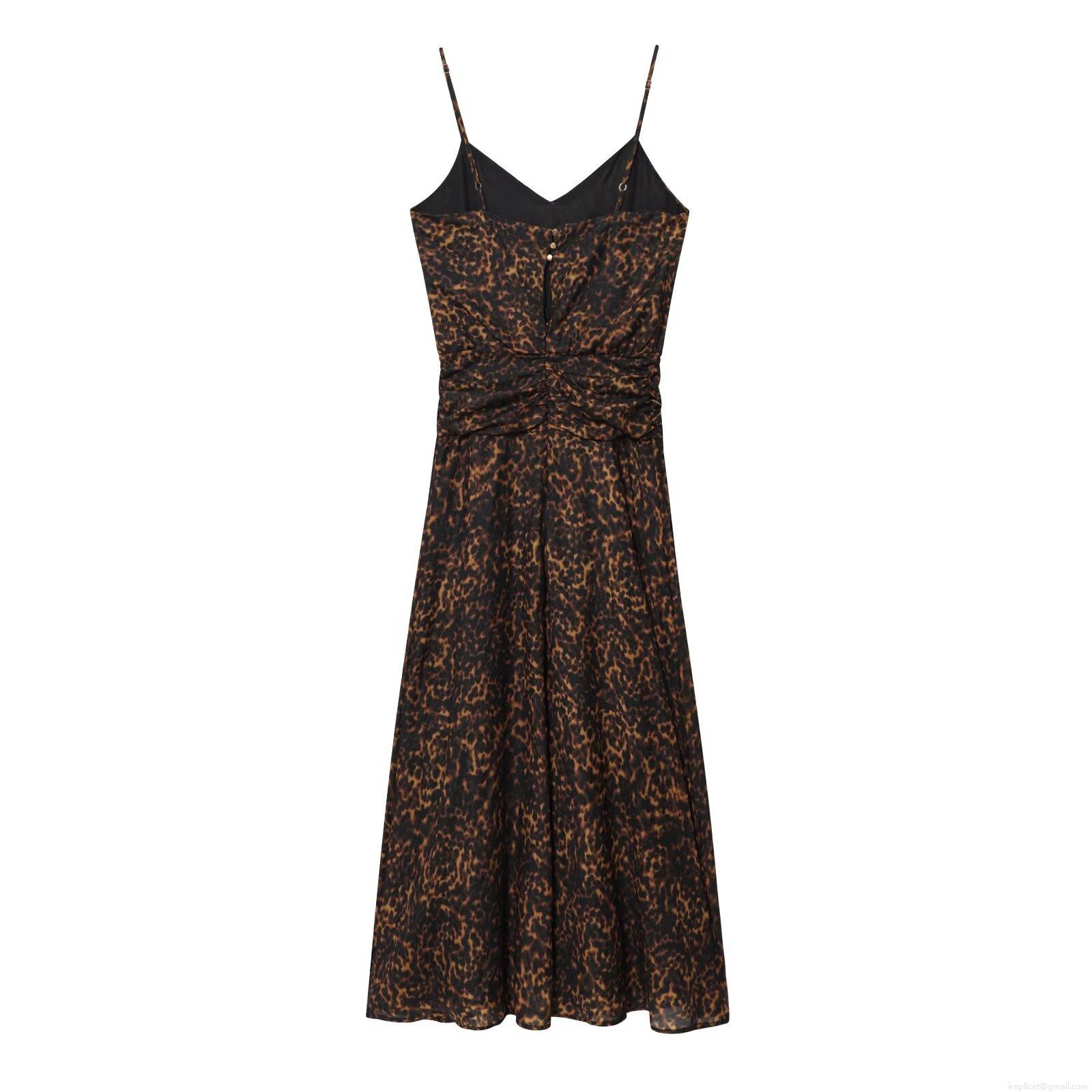 • Women Leopard Print Spaghetti Strap Cami Dress Sexy V-Neck Backless Pleated Midi Dress Slim Fit Polyester Streetwear Party Clubwear Long Dress