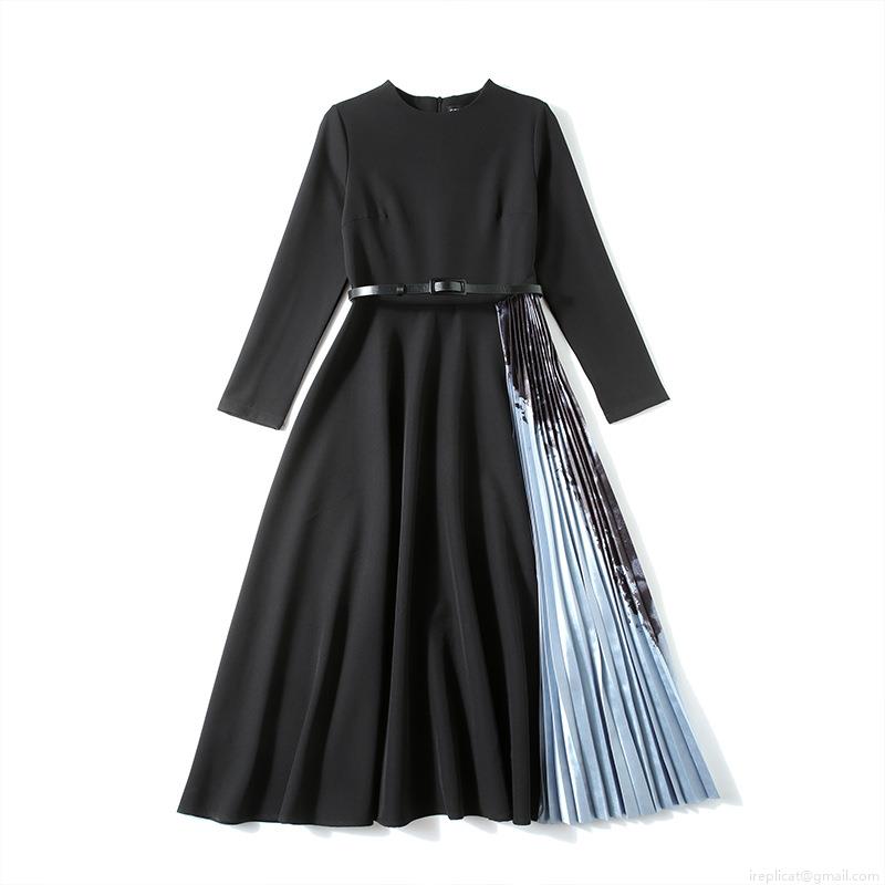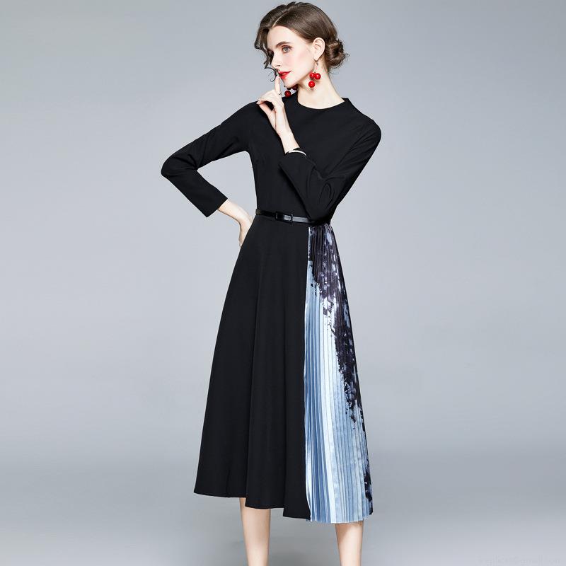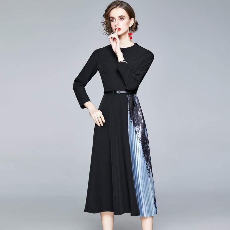 Women Long Sleeve Midi Dress Pleated Patchwork Print Elegant Round Neck Slim Fit Included Belt Polyester Autumn Fashion Black Blue Ladies Commuter Dress