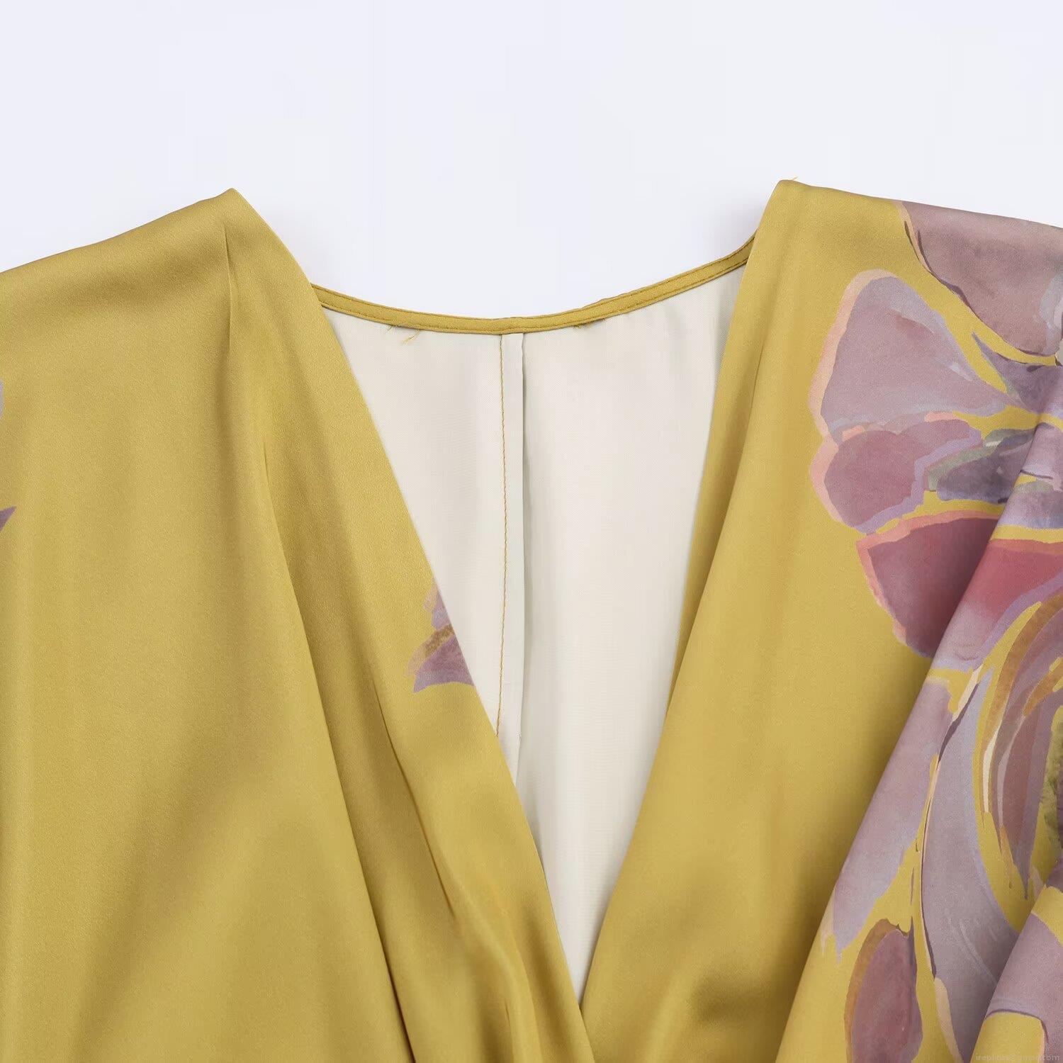 • Women Mustard Yellow Floral Print Satin Midi Dress Elegant V-Neck Long Sleeve Knot Waist A-Line Dress For Party Commute Autumn Fashion
