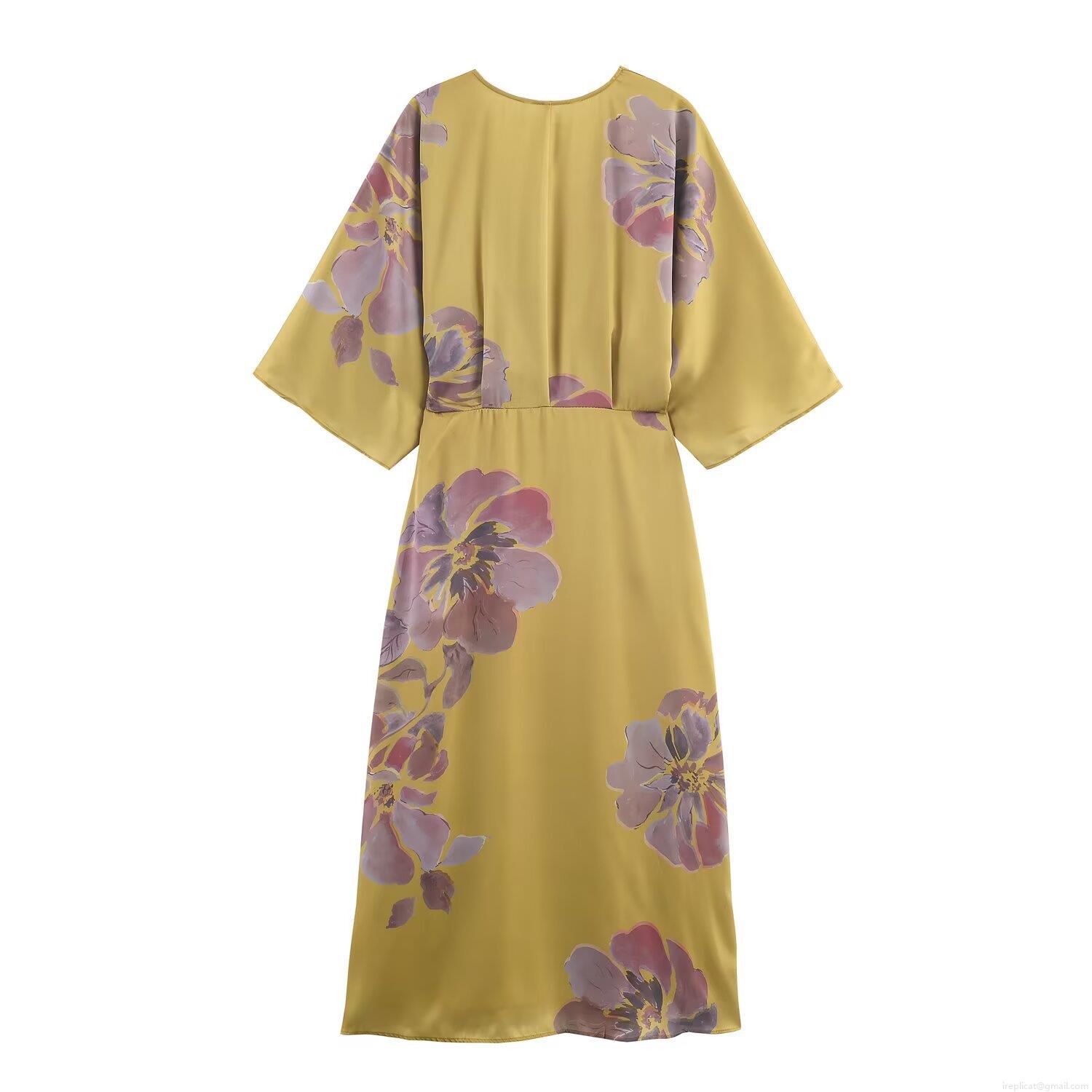 Women Mustard Yellow Floral Print Satin Midi Dress Elegant V-Neck Long Sleeve Knot Waist A-Line Dress For Party Commute Autumn Fashion