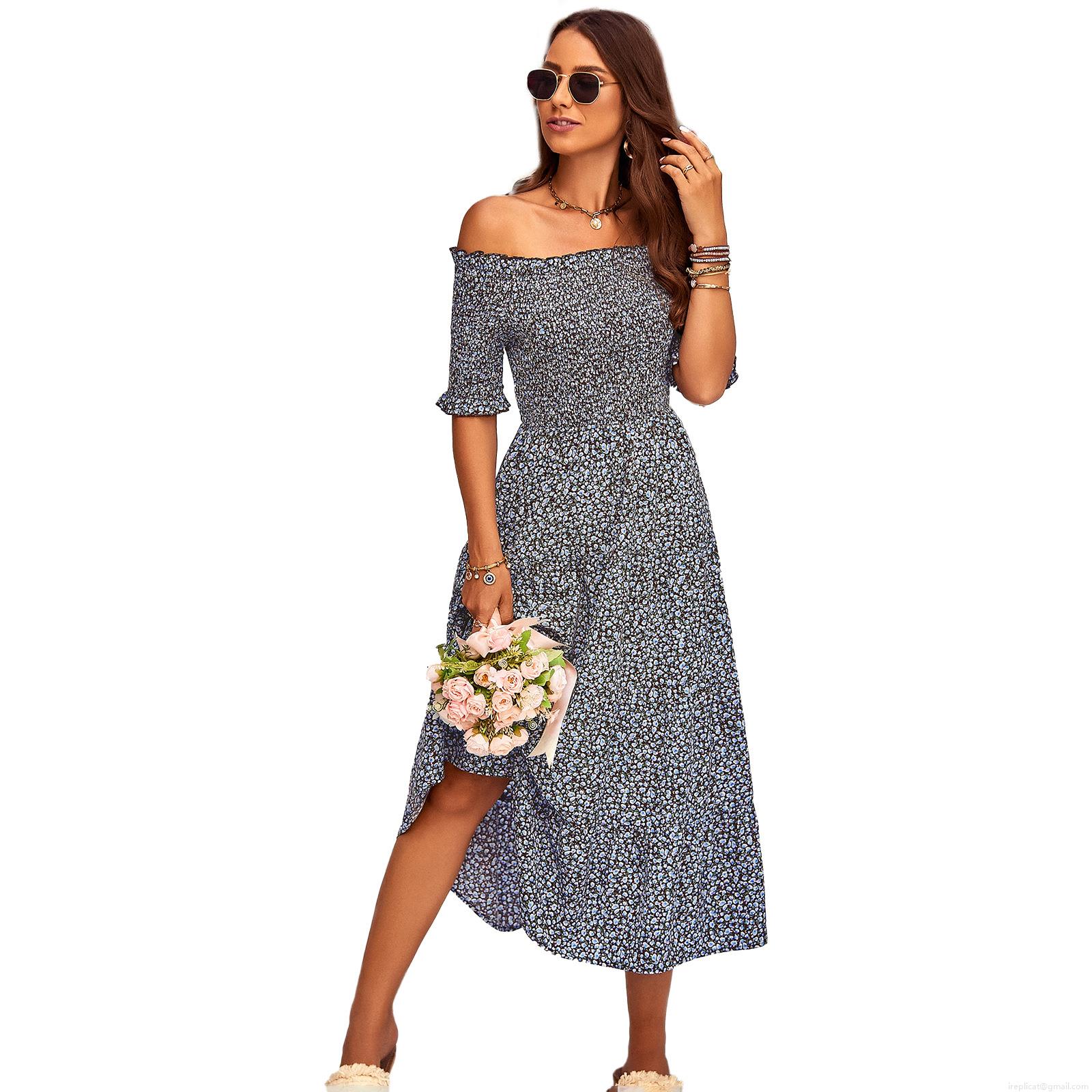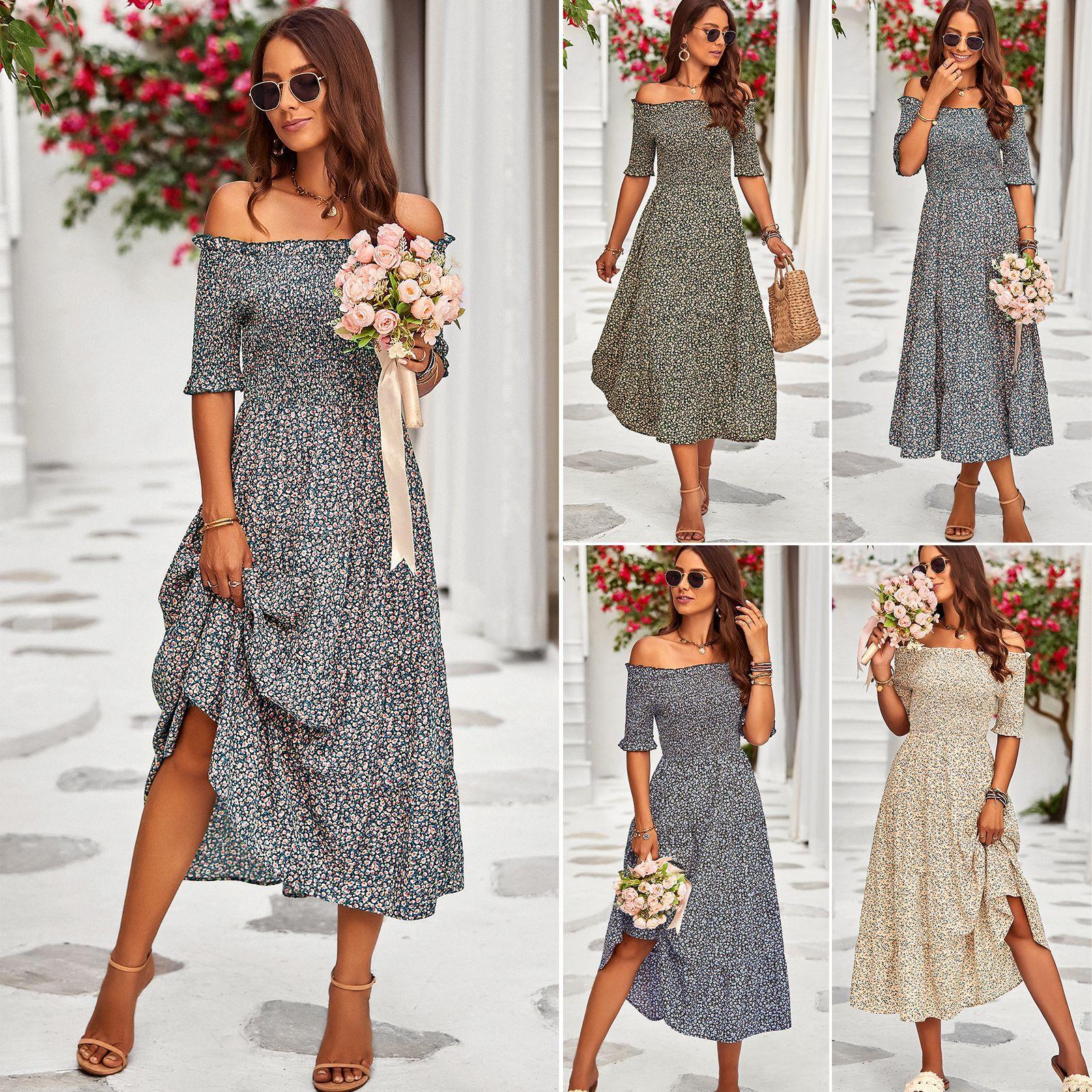 • Women Off Shoulder Floral Print Midi Dress Smocked Waist Puff Sleeve Slit Elegant Summer Vacation Resort Style A-Line Sundress