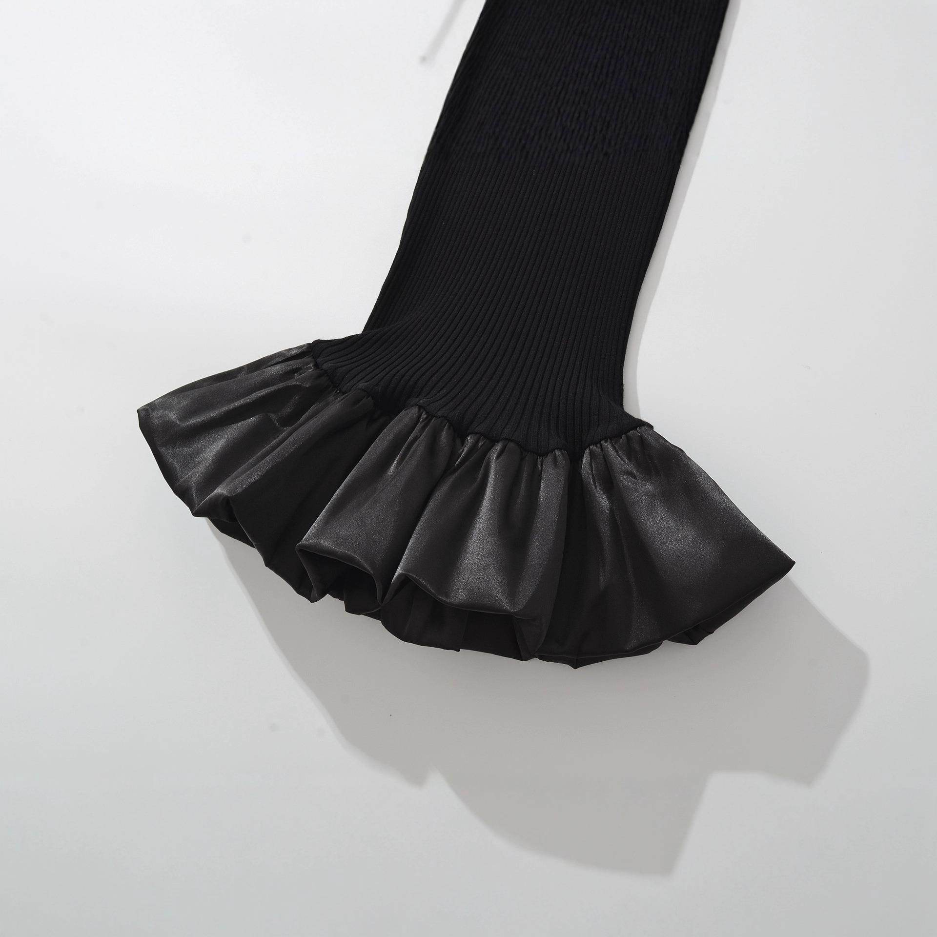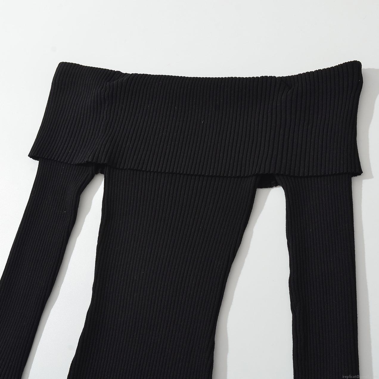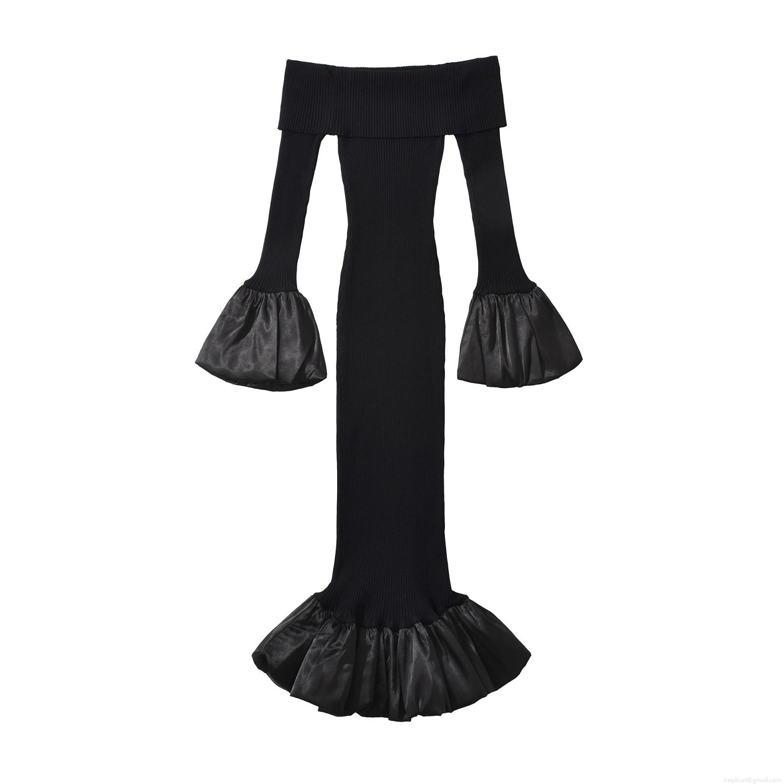 Women Off-the-Shoulder Knit Midi Bodycon Dress Rayon Nylon Ribbed Satin Flare Sleeve Ruffle Hem Elegant Streetwear Autumn Party Slim Fit Dress