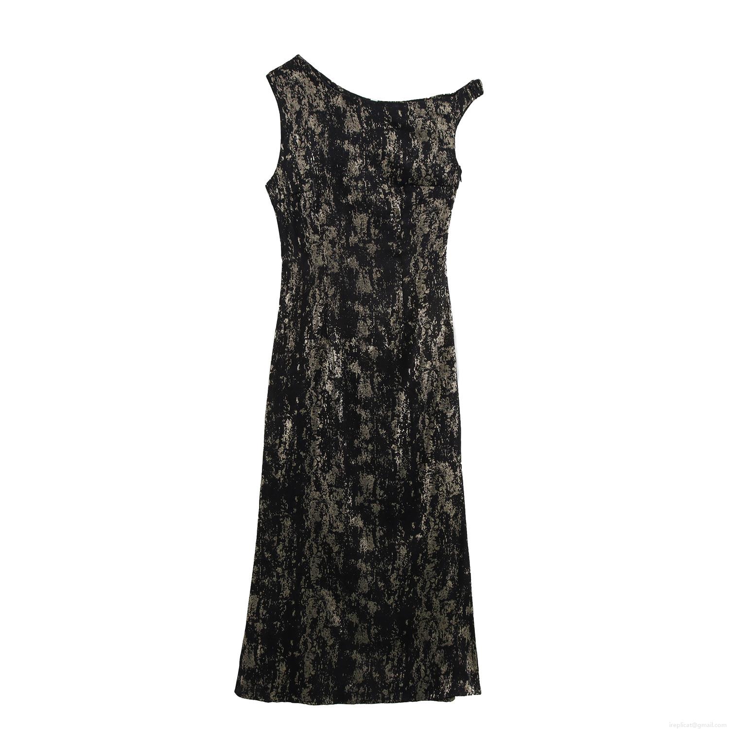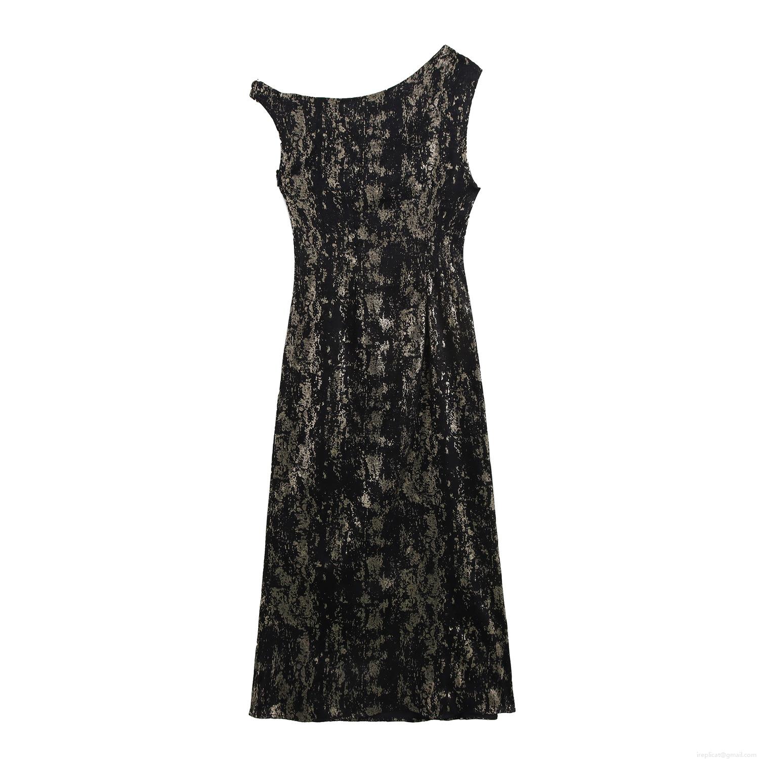 • Women One Shoulder Sleeveless Midi Dress Elegant Gold Stamped Polyester Abstract Print Sexy Bodycon Party Evening Gown
