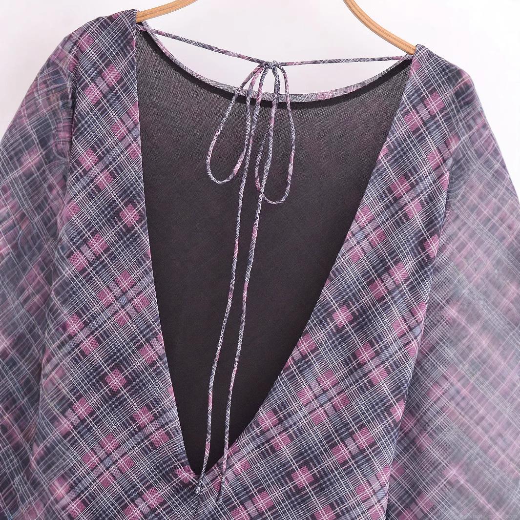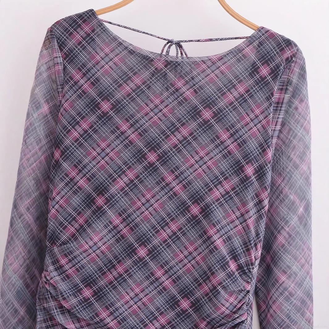 • Women Plaid Mesh Pleated Long Sleeve Dress Backless V-Back With Tie Irregular Hem European Fashion Casual Summer Midi Dress