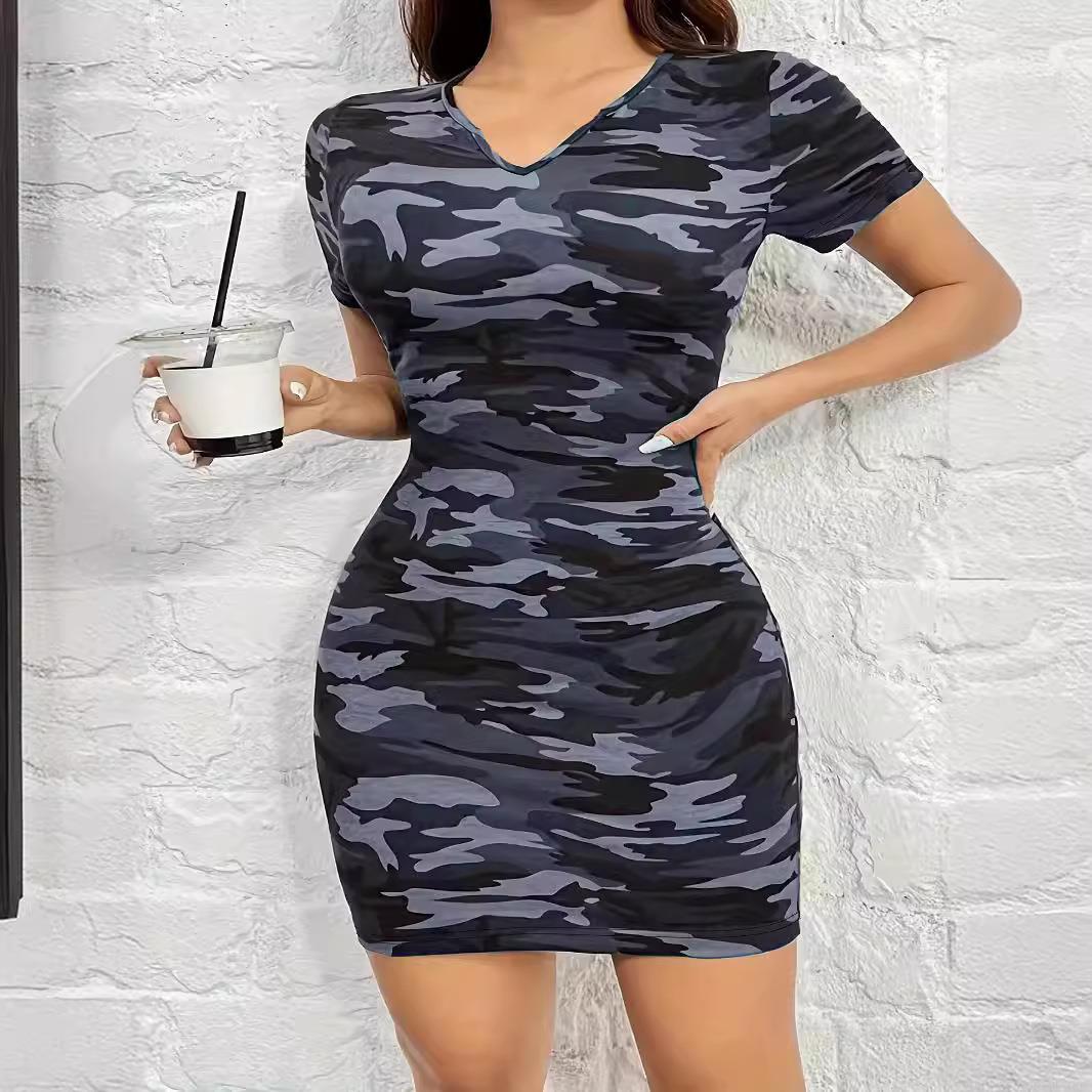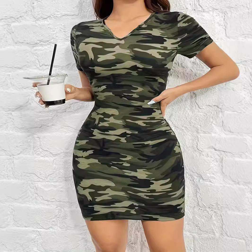 • Women Plus Size Camouflage Print V-Neck Short Sleeve Bodycon Midi Dress Casual Slim Fit Camo Sheath Clubwear Polyester Spandex Summer Sundress