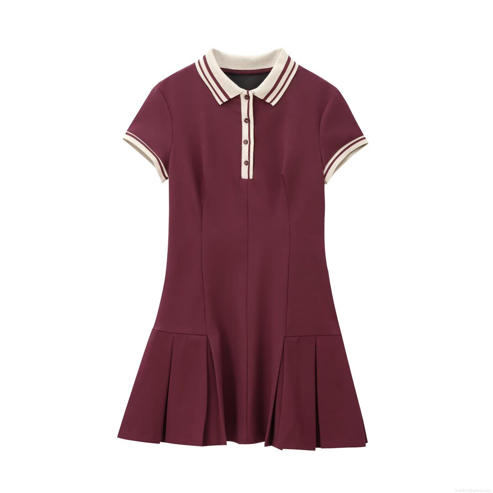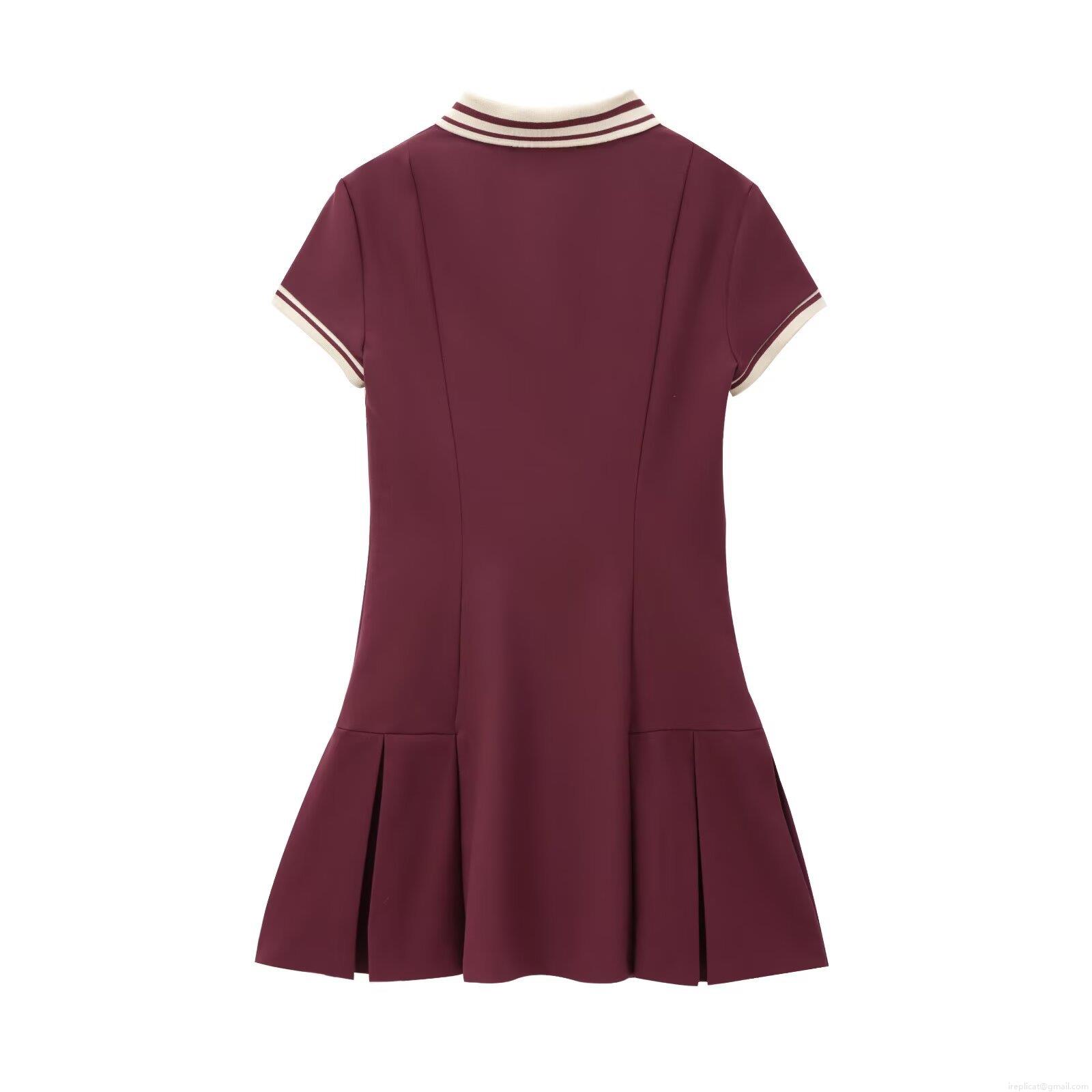 • Women Preppy Style Polo Neck Short Sleeve Pleated Dress Contrast Stripe Ribbed Midi Dress Elegant Solid Color Knit Polyester Dress For Lady