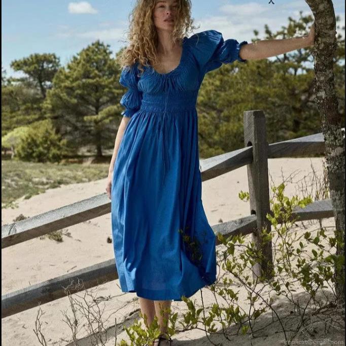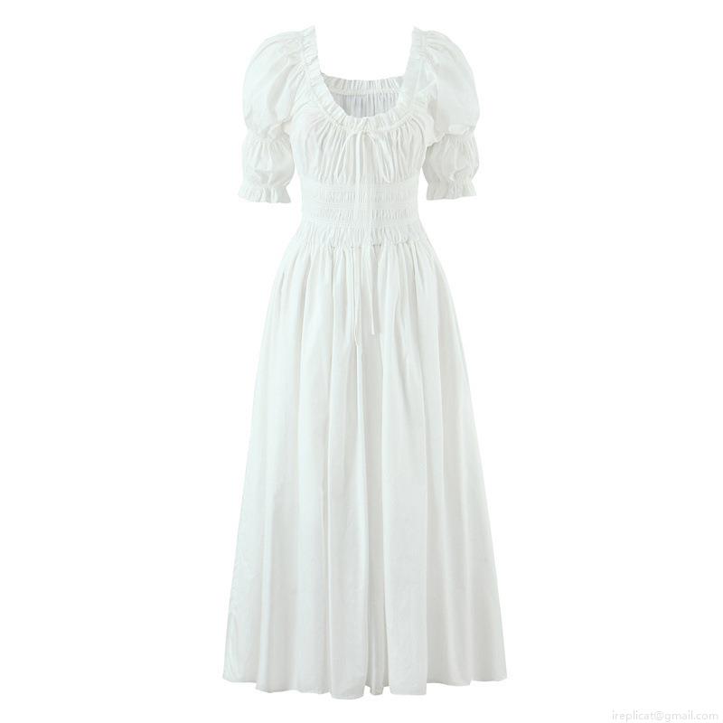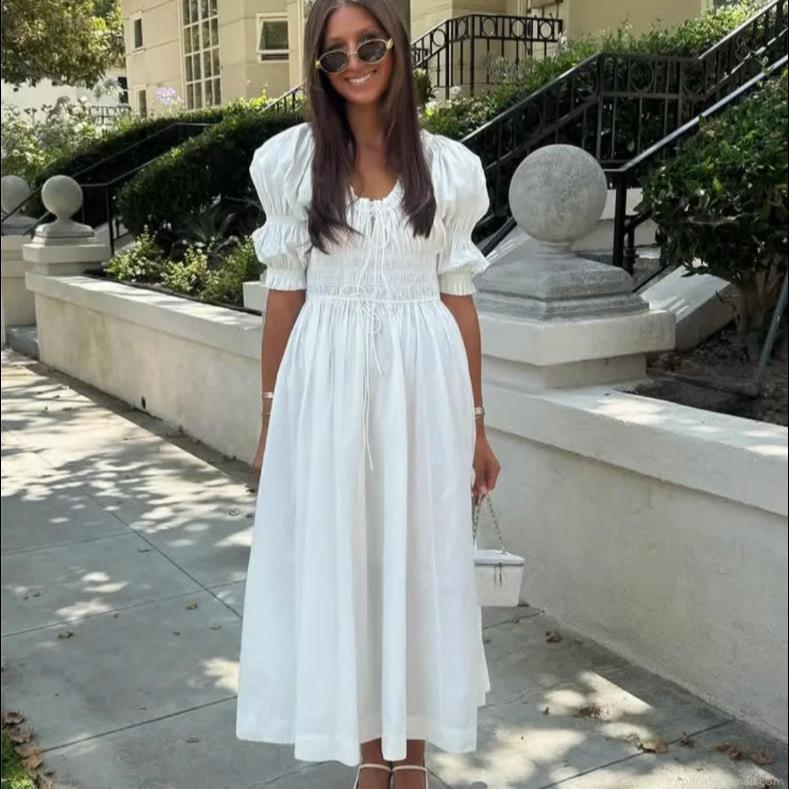 • Women Puff Sleeve Dress 100% Cotton Smocked High Waist Square Neck Drawstring Midi Dress Elegant Summer Vacation Party Sweet A-Line Long Dresses