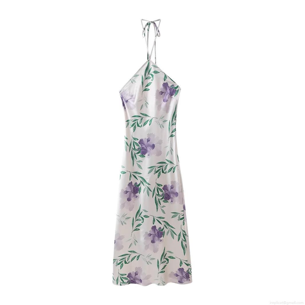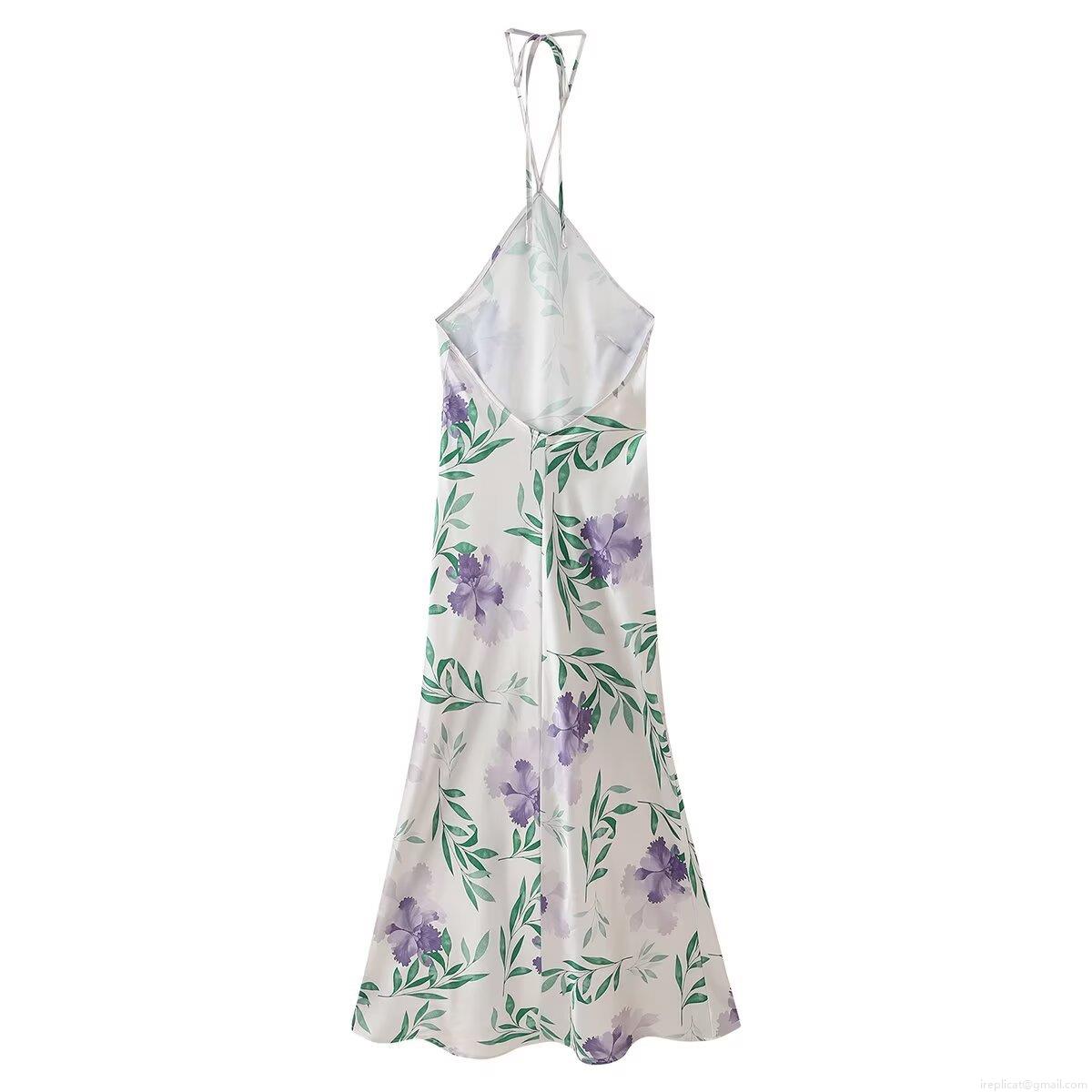 • Women Retro Chinese Style Halterneck Backless Midi Dress Elegant Floral Print Satin Sleeveless High Waist A-Line Dress For Party Vacation
