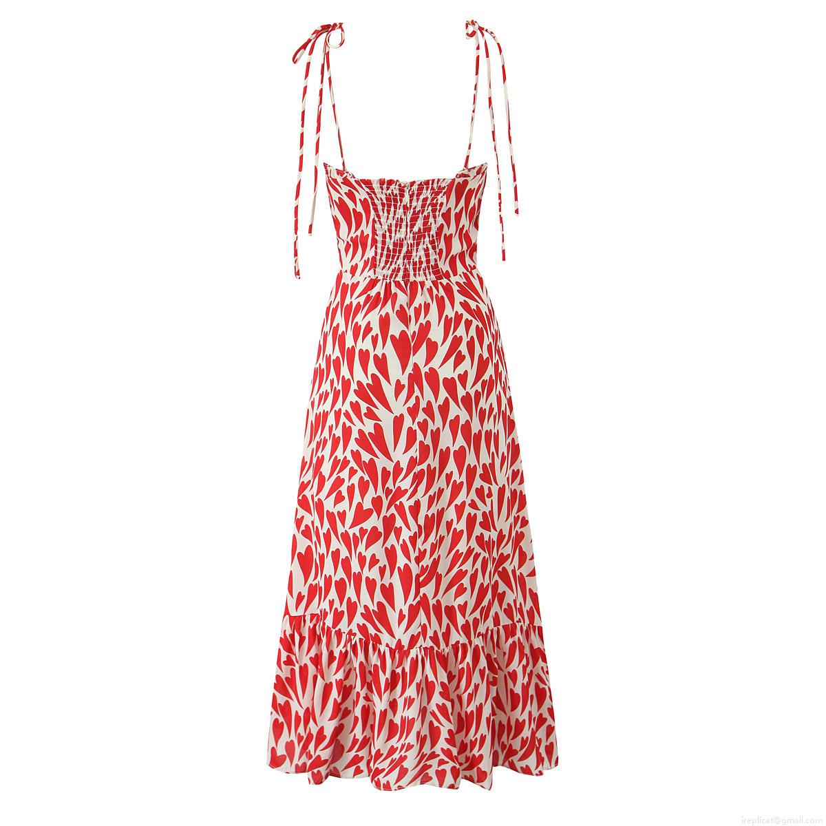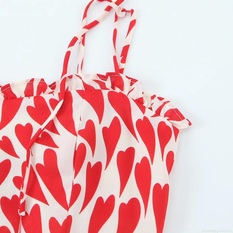 • Women Retro Heart Print Camisole Midi Dress Vintage Ruffle Hem Sleeveless Polyester Smocked Back Sundress For Summer Vacation Party Streetwear