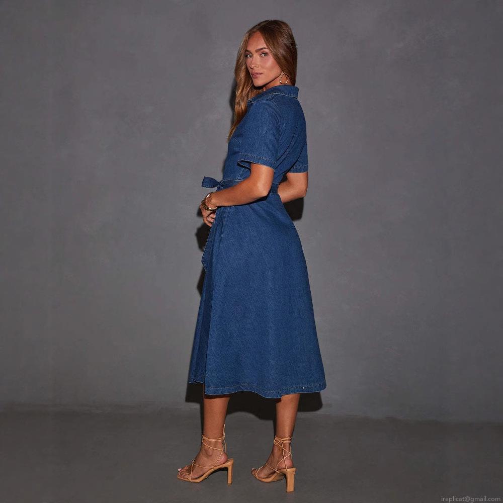 • Women Retro V-Neck Denim Midi Dress French Elegant Short Sleeve Button Front A-Line Jean Dress With Waist Tie Belt For Daily Office Summer