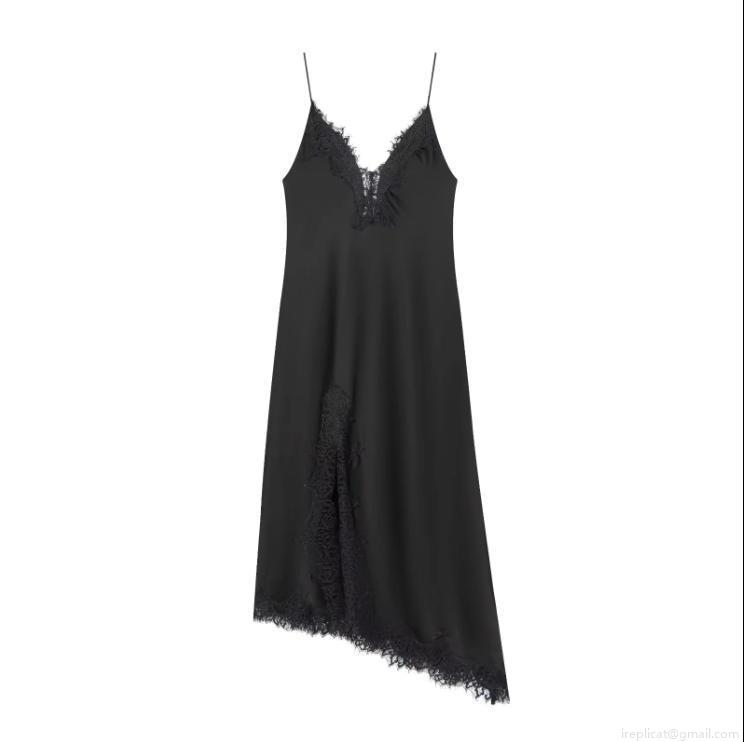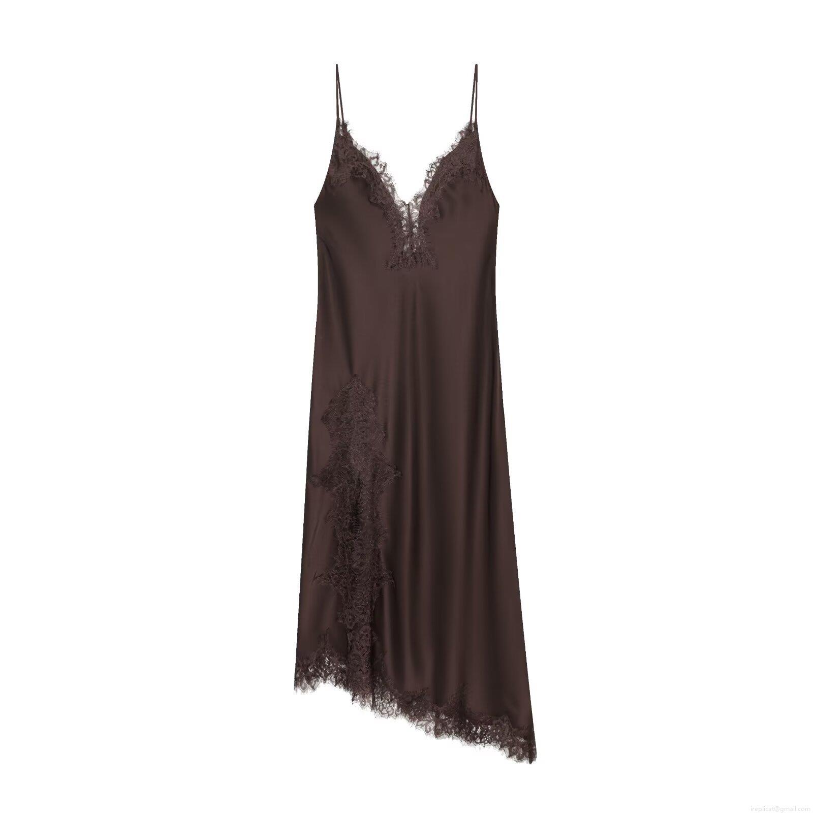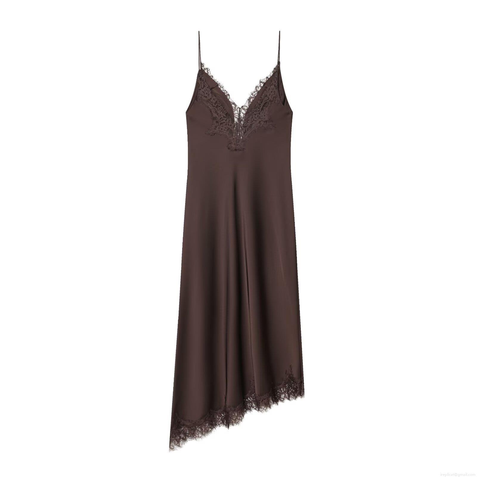 Solid Color, V-neck, Lace Patchwork, Silk Satin Texture, Asymmetrical Cut