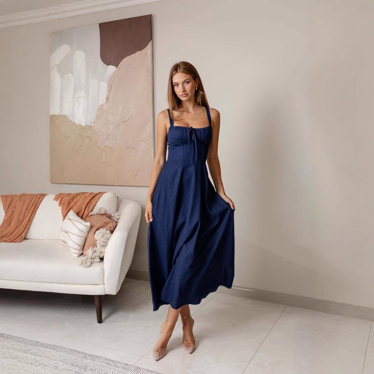 • Women Sexy Backless Denim Texture Midi Dress Summer Sleeveless Spaghetti Strap High Waist A-Line Sundress Solid Deep Blue Fashion Streetwear