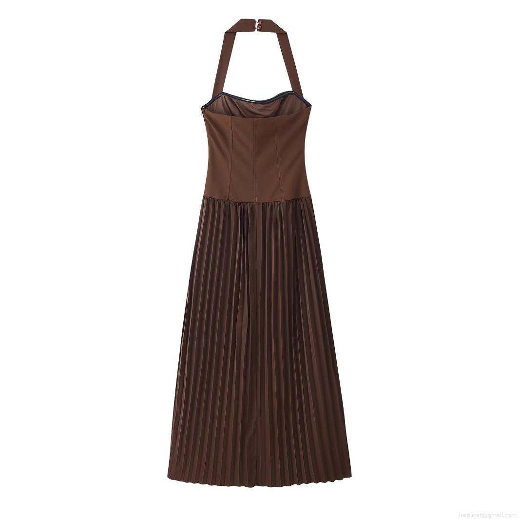 • Women Sexy Backless Halterneck Pleated Maxi Dress European Street Style Sleeveless Splicing A-Line Long Dress For Party Vacation