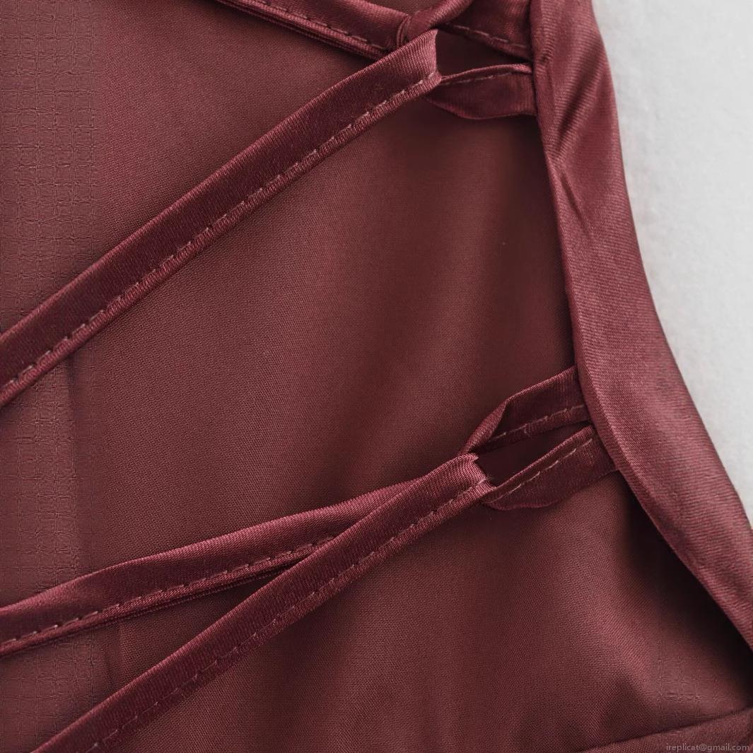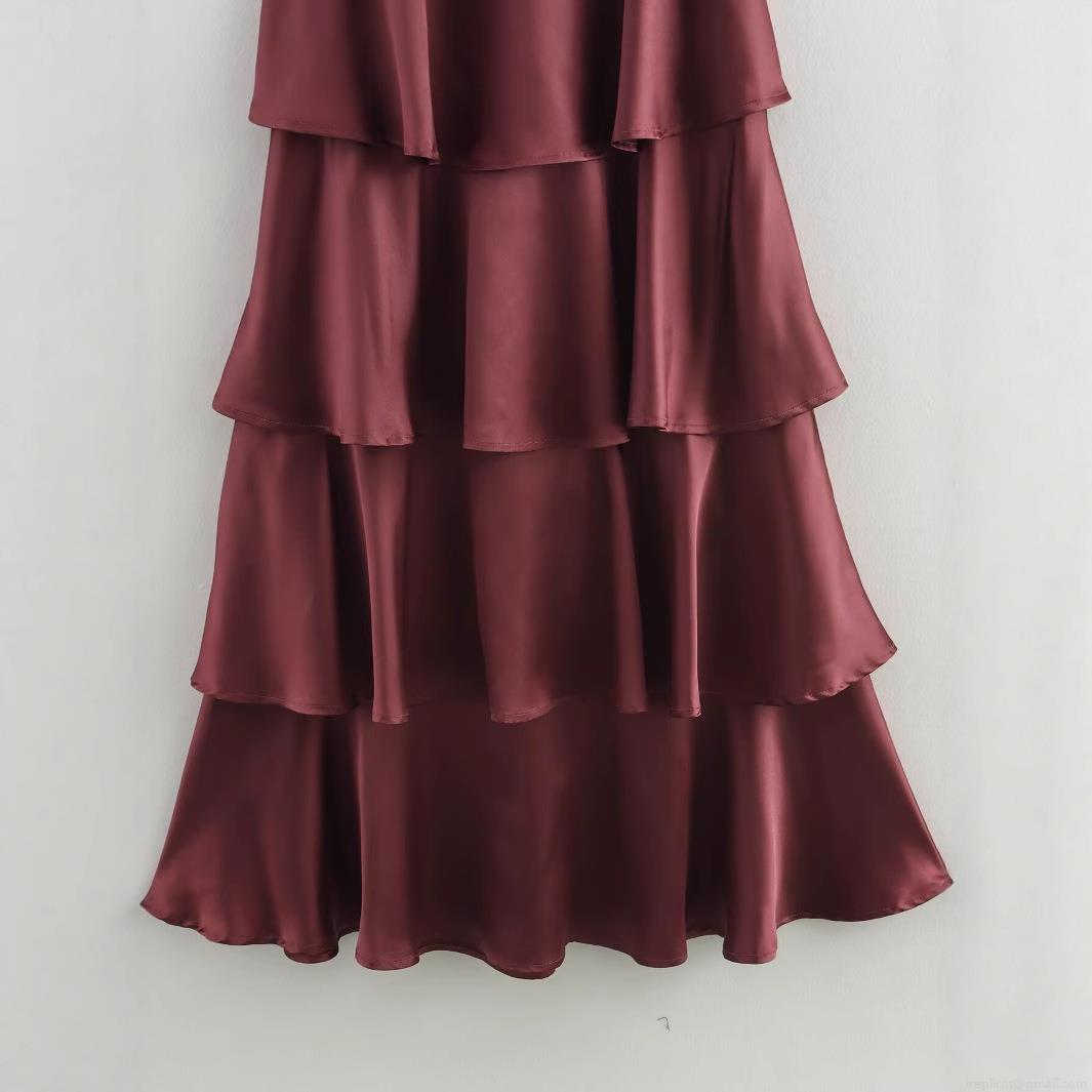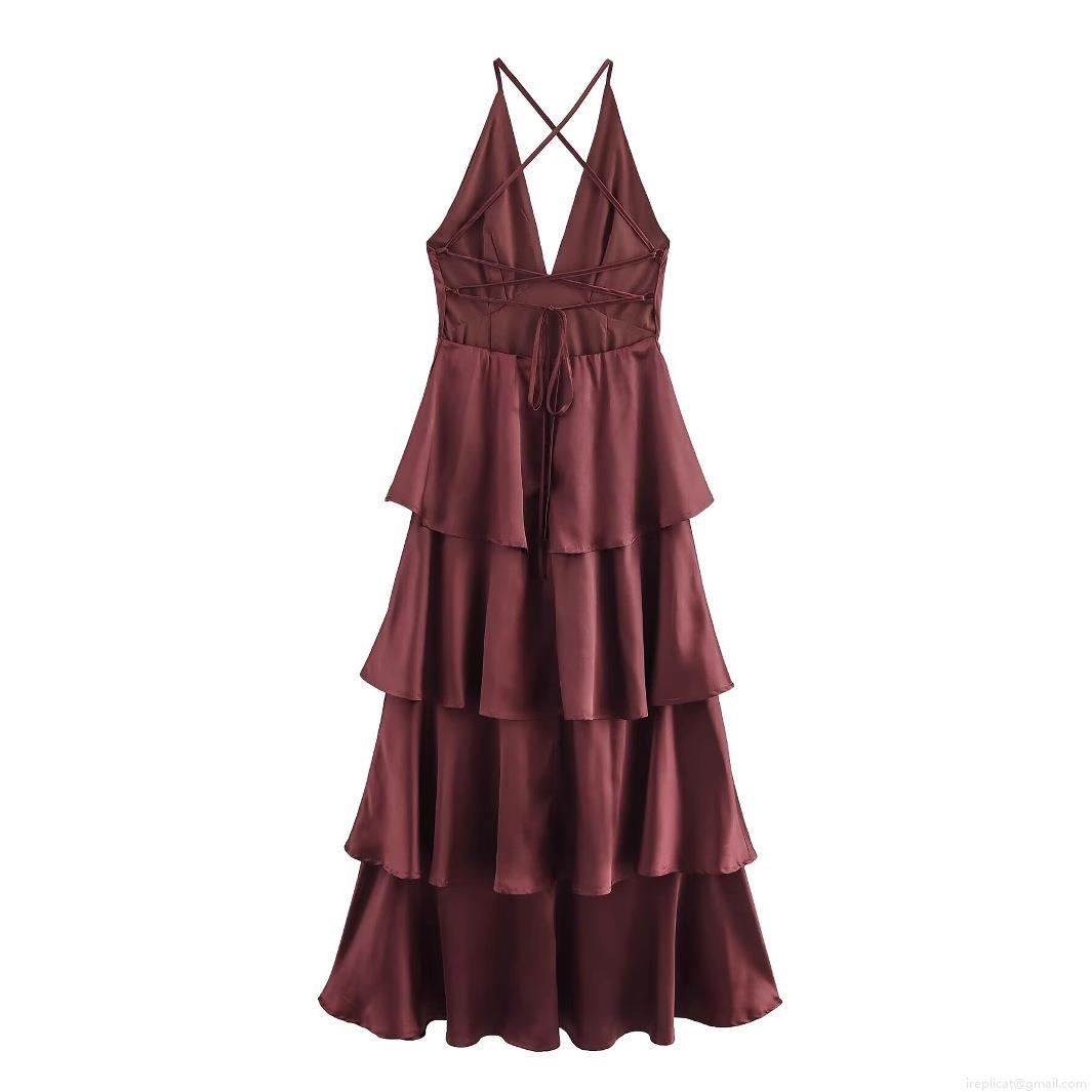 • Women Sexy Backless Satin Midi Dress V Neck Crossover Straps Tiered Cake Hem 100% Polyester Evening Party Wedding Guest Dress