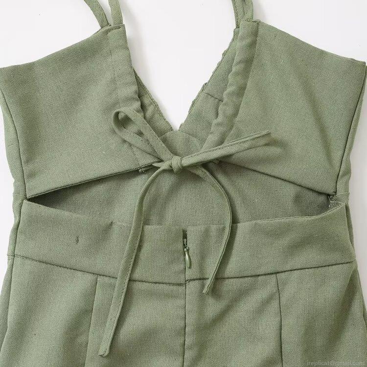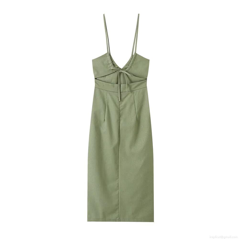 • Women Sexy Backless V-Neck Cami Midi Dress Front Slit Bow Tie Back Cotton Blend Summer Vacation Party Dress Avocado Green Solid Color Sleeveless Slinky Dress