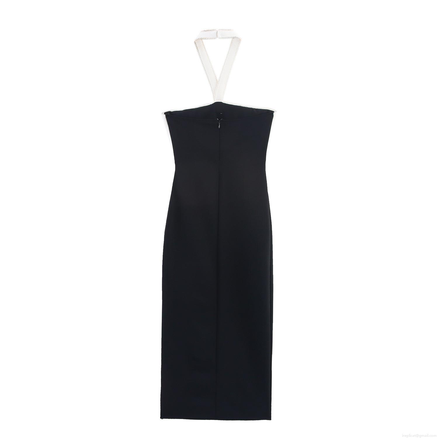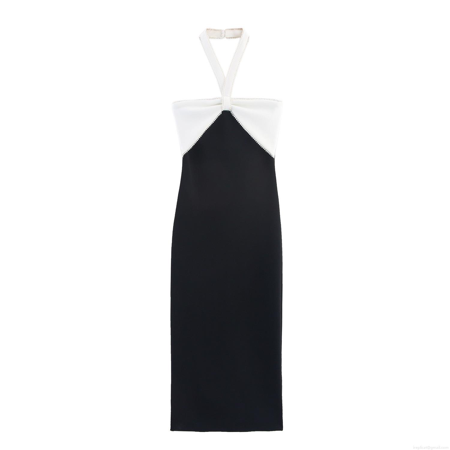 Women Sexy Black White Color Block Halter Backless Midi Dress With Bow Knot Pearl Trim Slim Fit Bodycon Party Evening Dress