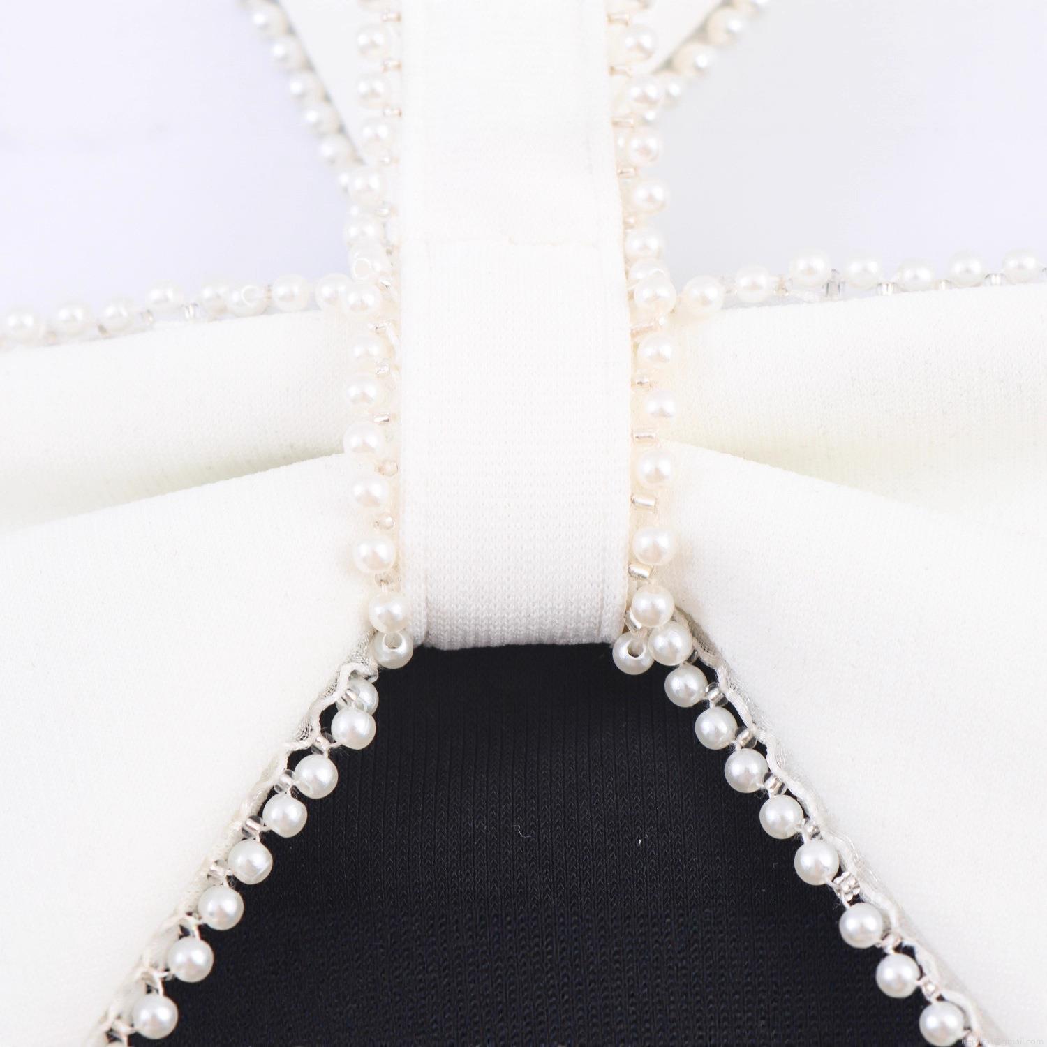 • Women Sexy Black White Color Block Halter Backless Midi Dress With Bow Knot Pearl Trim Slim Fit Bodycon Party Evening Dress