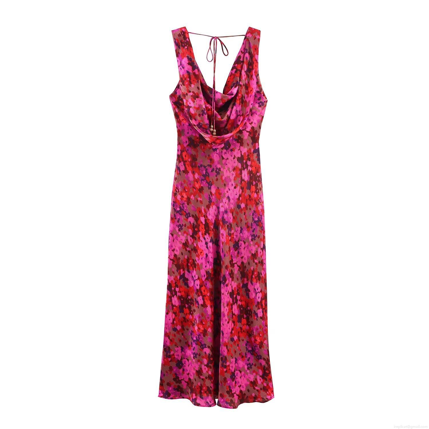 • Women Sexy Cowl Neck Backless Floral Print Satin Midi Dress Elegant Lace-up A-Line Sleeveless Party Vacation Long Dresses