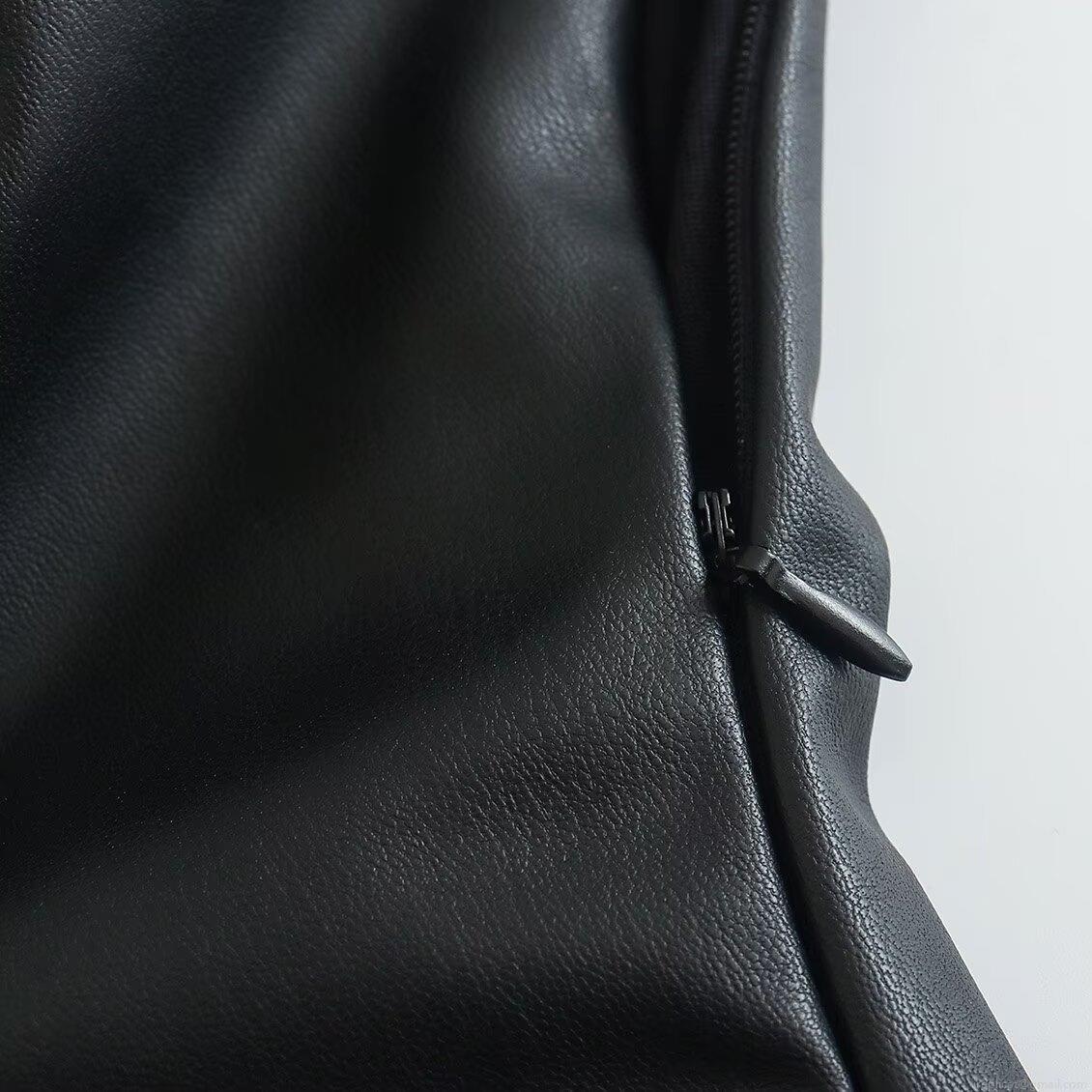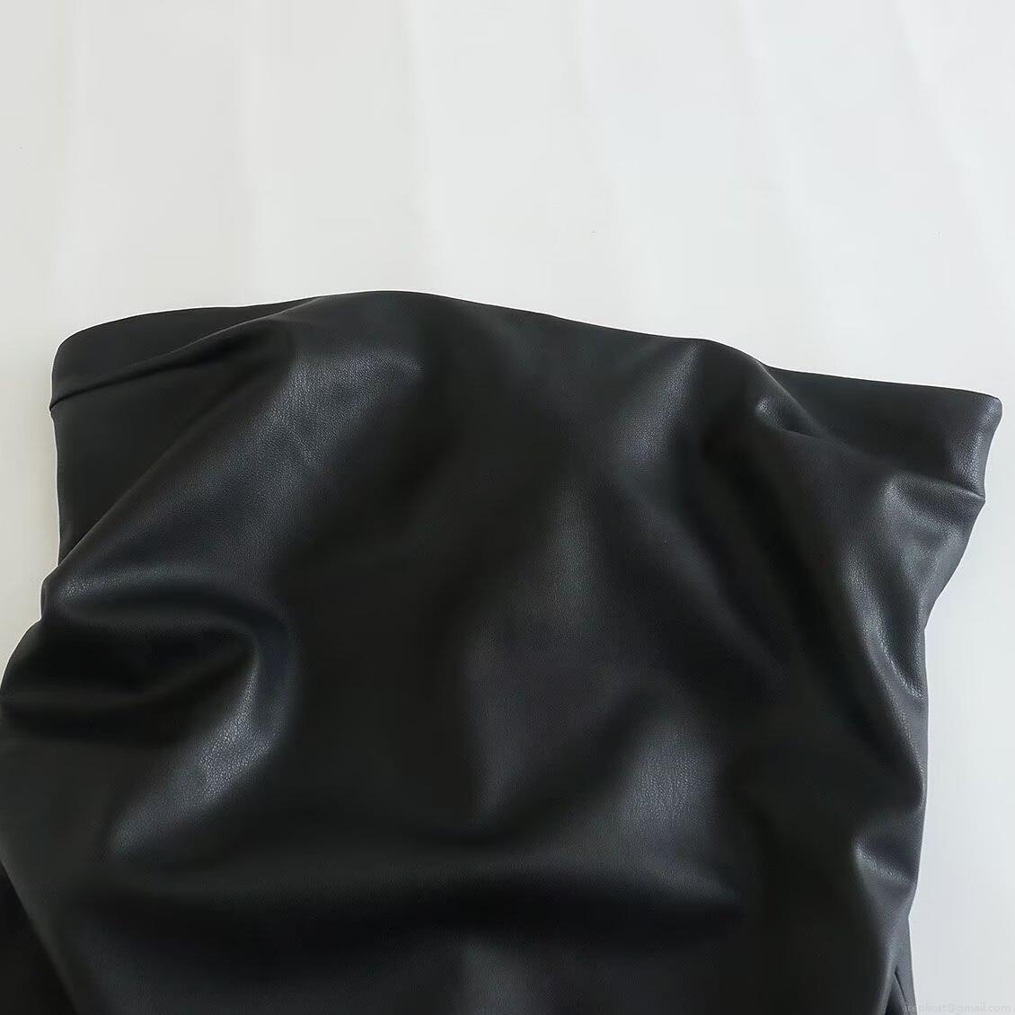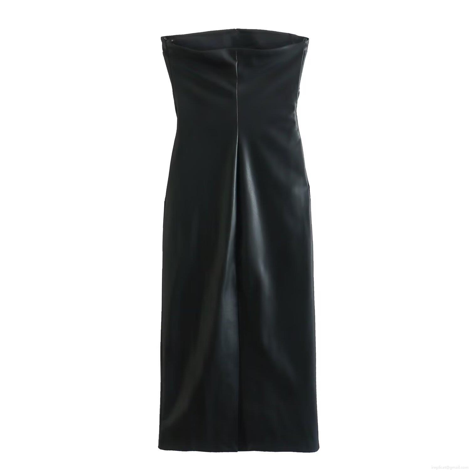 Women Sexy Faux Leather Bandeau Midi Dress Ruched Bodycon Side Zipper Solid Color Sleeveless Party Evening Clubwear Strapless Dress