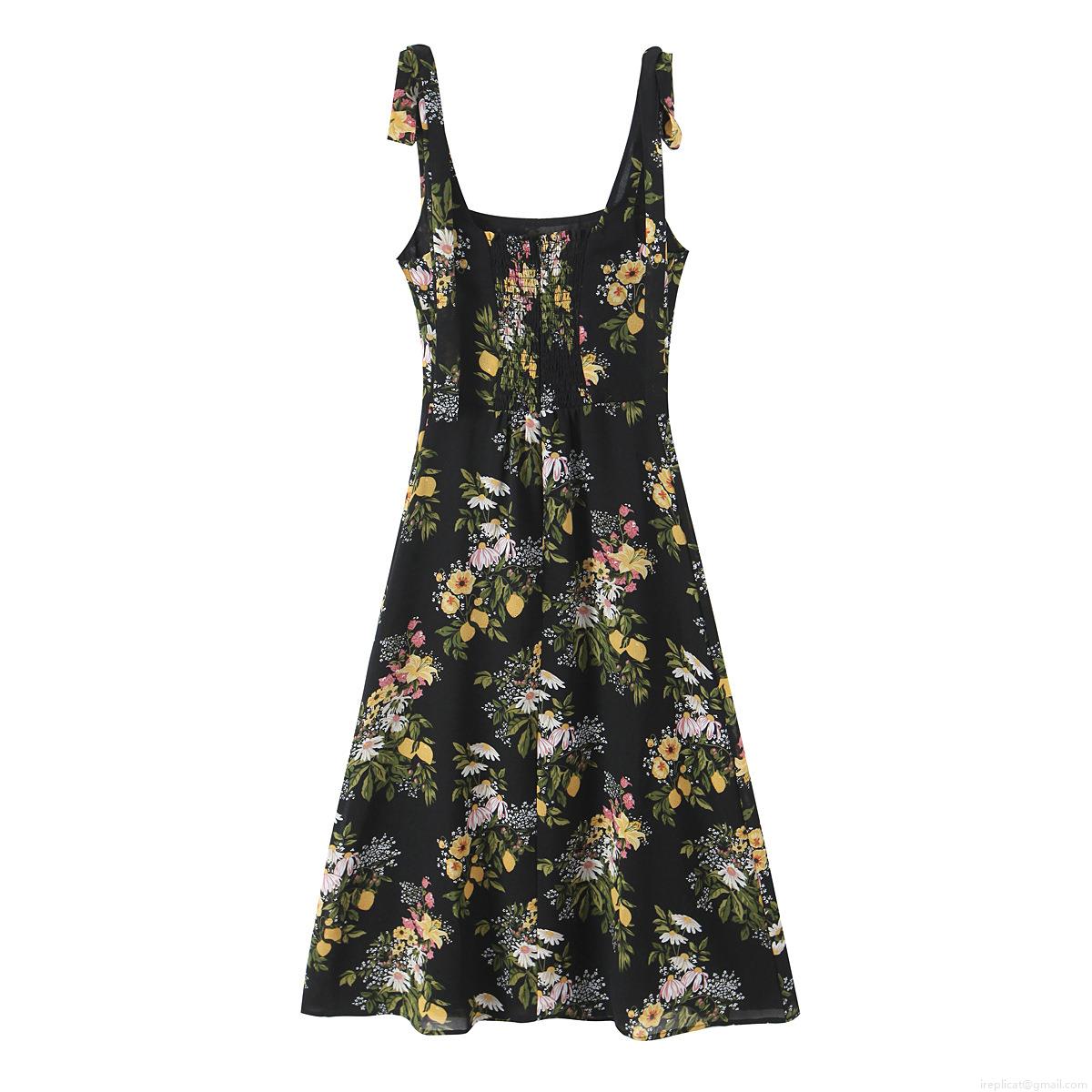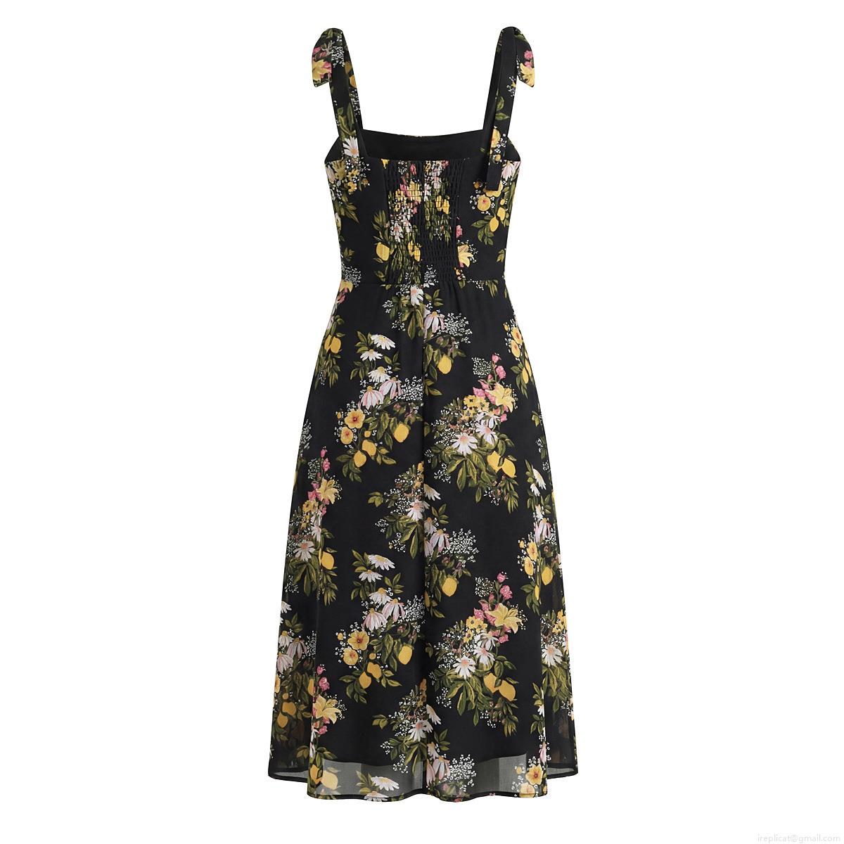 • Women Sexy Floral Print Tie Shoulder Cami Dress Sleeveless Square Neck Smocked Waist Split Midi Dress For Summer Beach Vacation Party