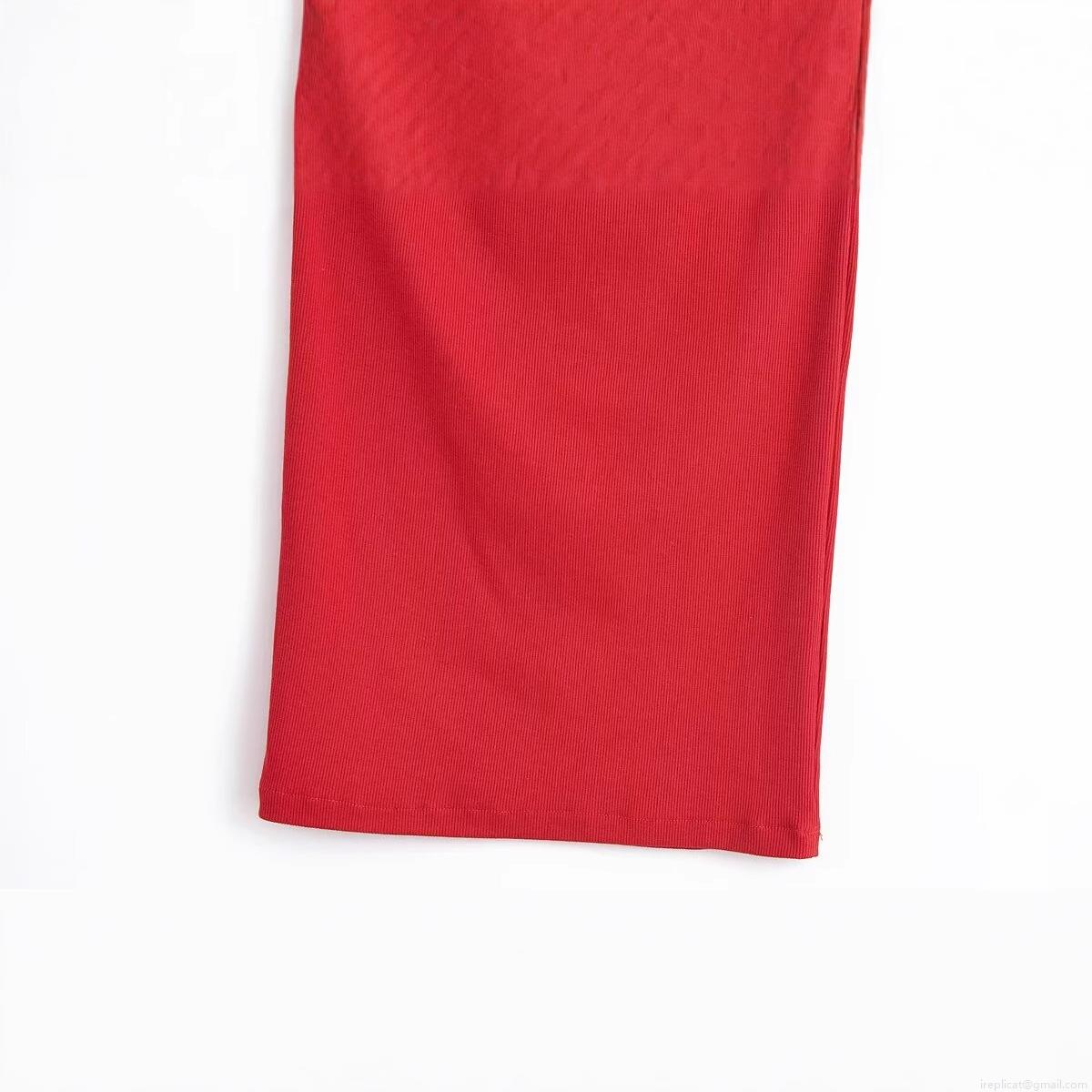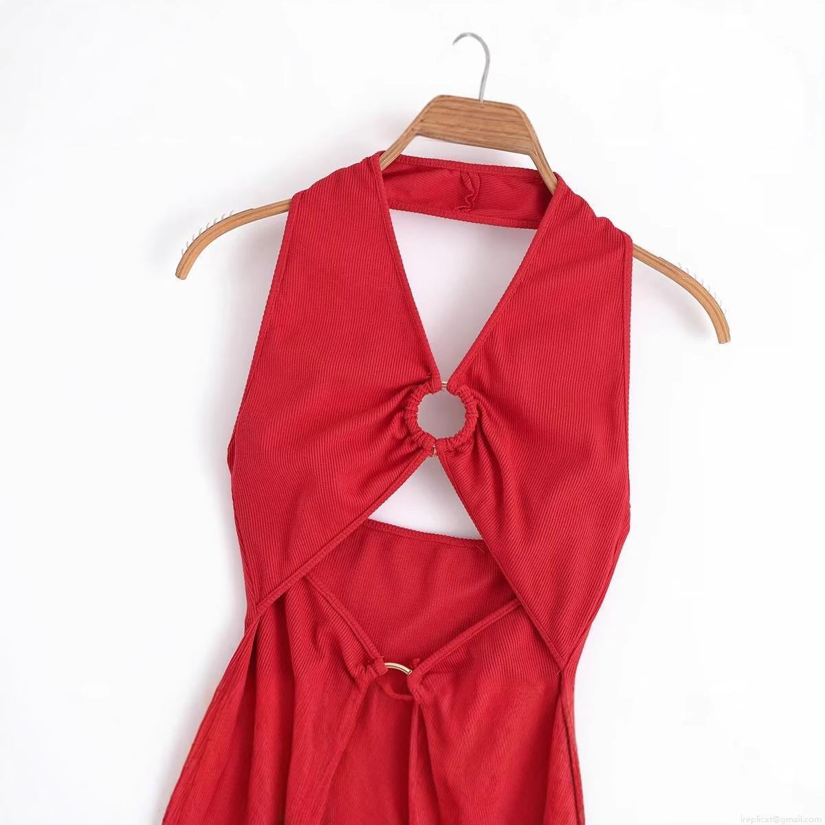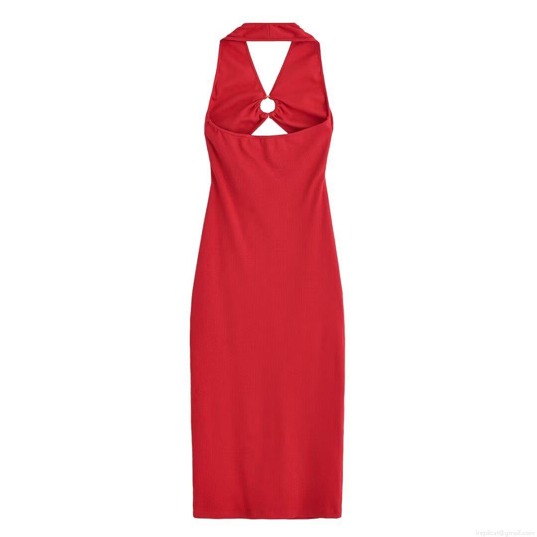 • Women Sexy Halter Neck Hollow Out Ribbed Knit Midi Dress With Metal Ring Bodycon Backless Solid Color Polyester Party Dress