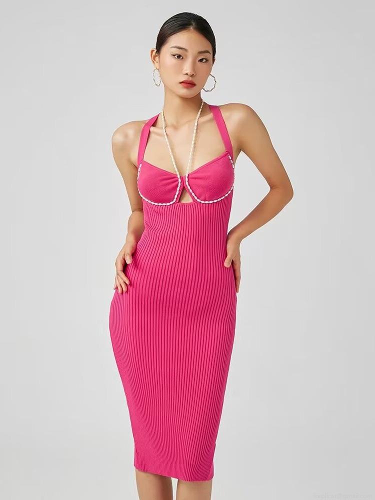 Women Sexy Halter Neck Pearl Chain Knit Midi Dress Backless Bodycon Ribbed Sleeveless Party Clubwear Dress
