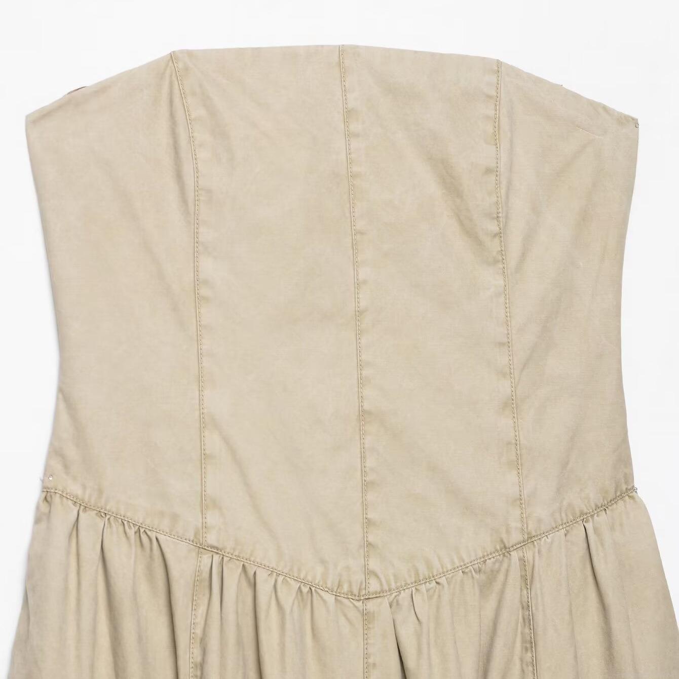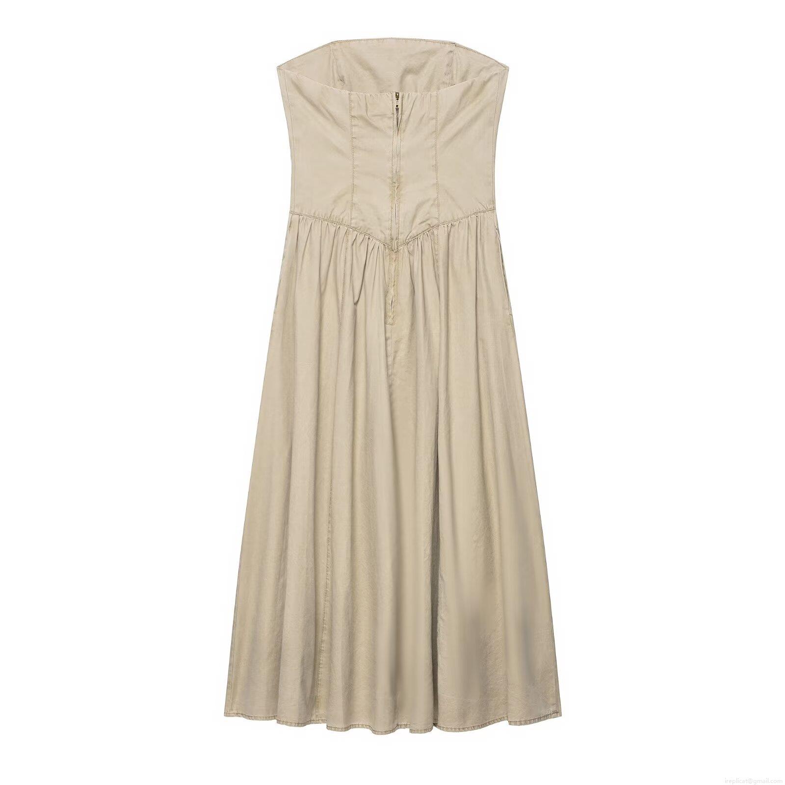 Women Sexy Khaki Strapless Midi Dress Polyester Spandex Blend Backless Zipper A-Line Pleated Stitching Elegant Party Evening Dress For Ladies