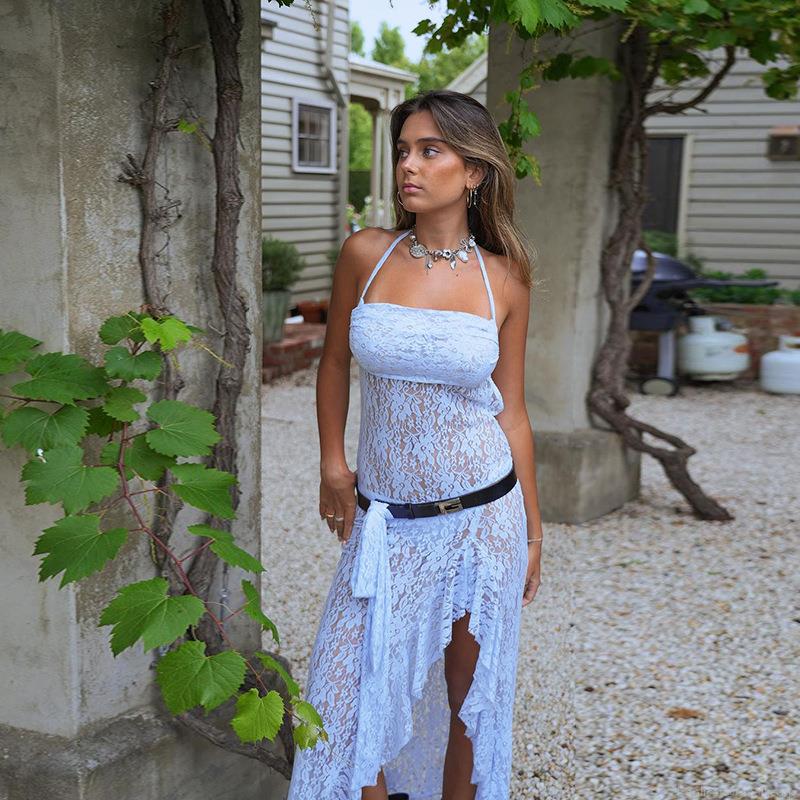 • Women Sexy Light Blue Floral Lace Halter Dress Backless See-through High Slit Midi Party Vacation Dress Made Of Nylon And Spandex