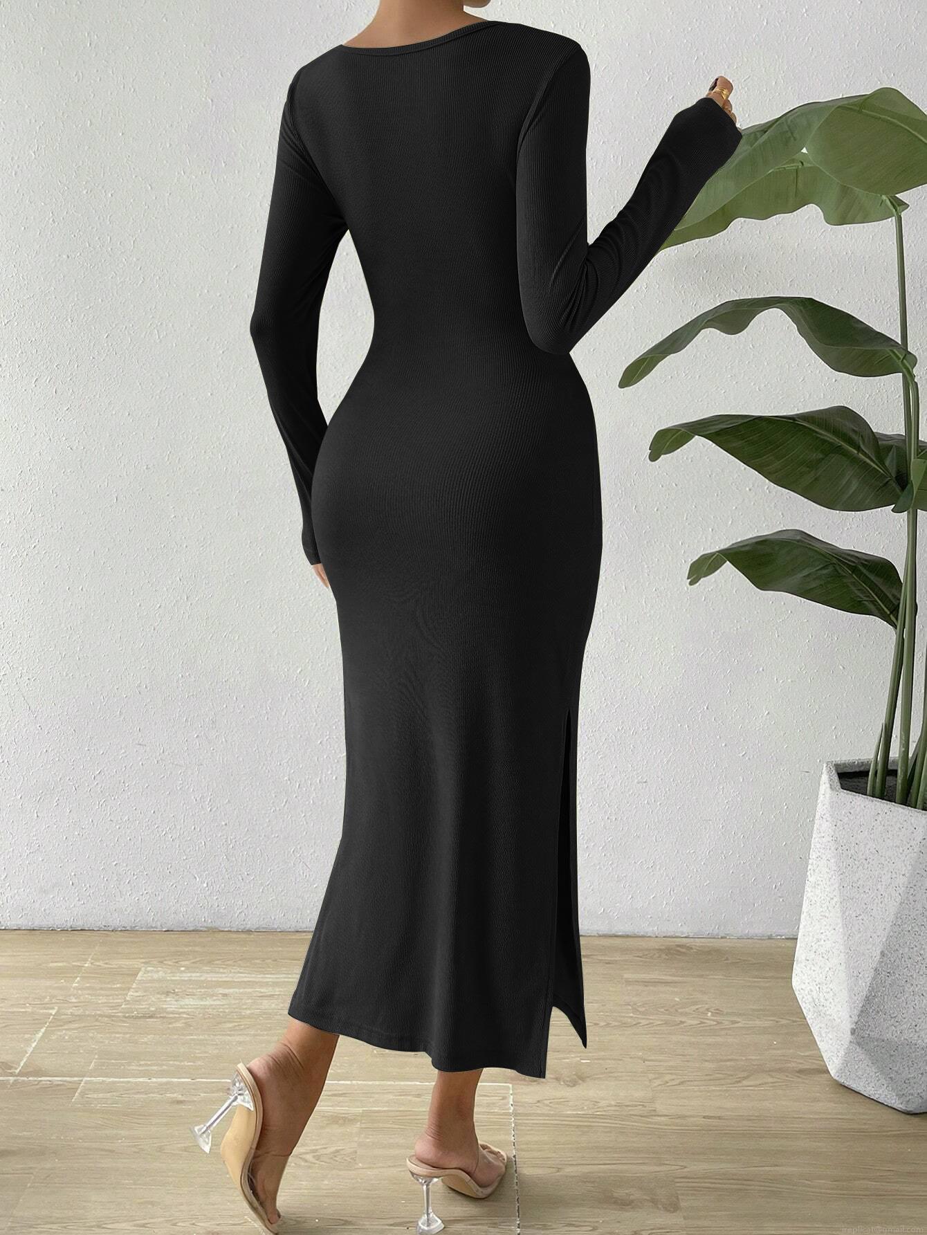 • Women Sexy Long Sleeve Round Neck Cutout Knot Midi Dress Elegant High Slit Bodycon Ribbed Knit Party Evening Dress