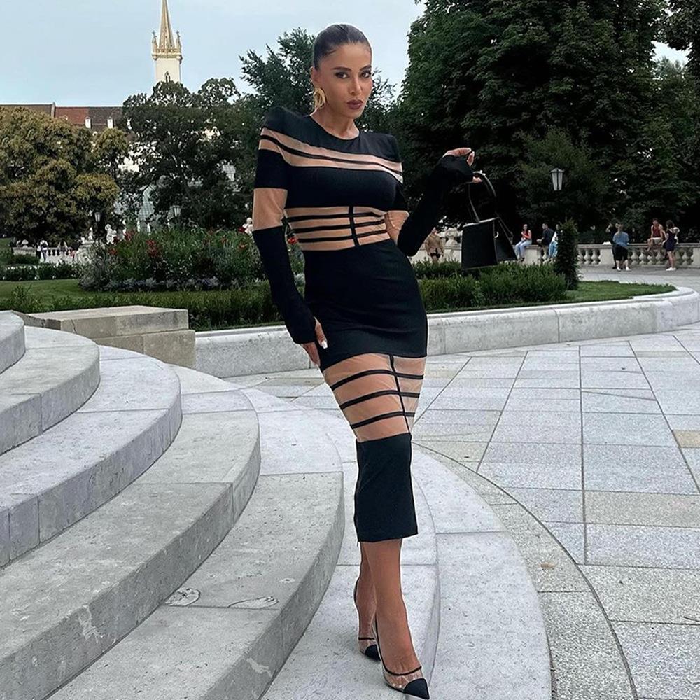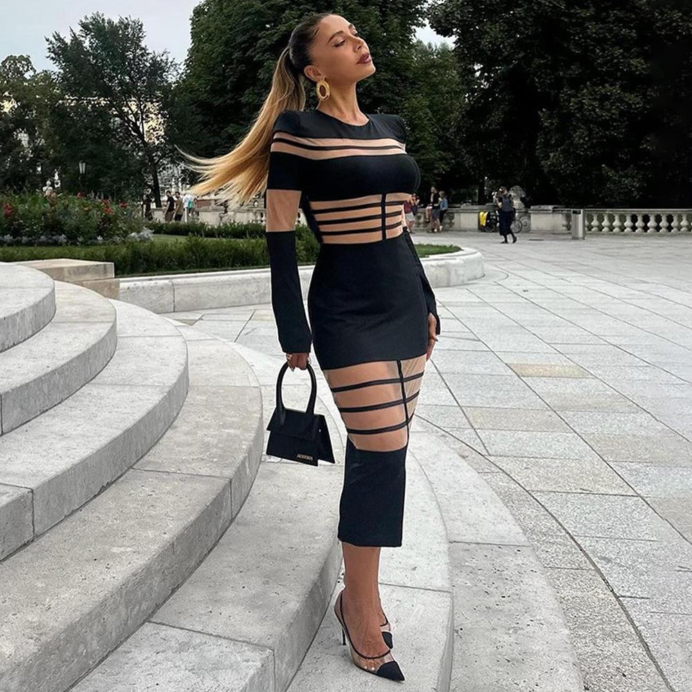 Women Sexy Mesh Patchwork See-through Bodycon Midi Dress Long Sleeve Round Neck High Waist Slim Fit Polyester Club Party Streetwear Autumn Winter Dress