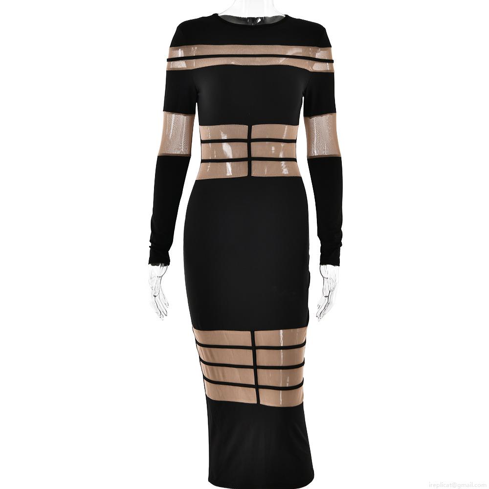 • Women Sexy Mesh Patchwork See-through Bodycon Midi Dress Long Sleeve Round Neck High Waist Slim Fit Polyester Club Party Streetwear Autumn Winter Dress