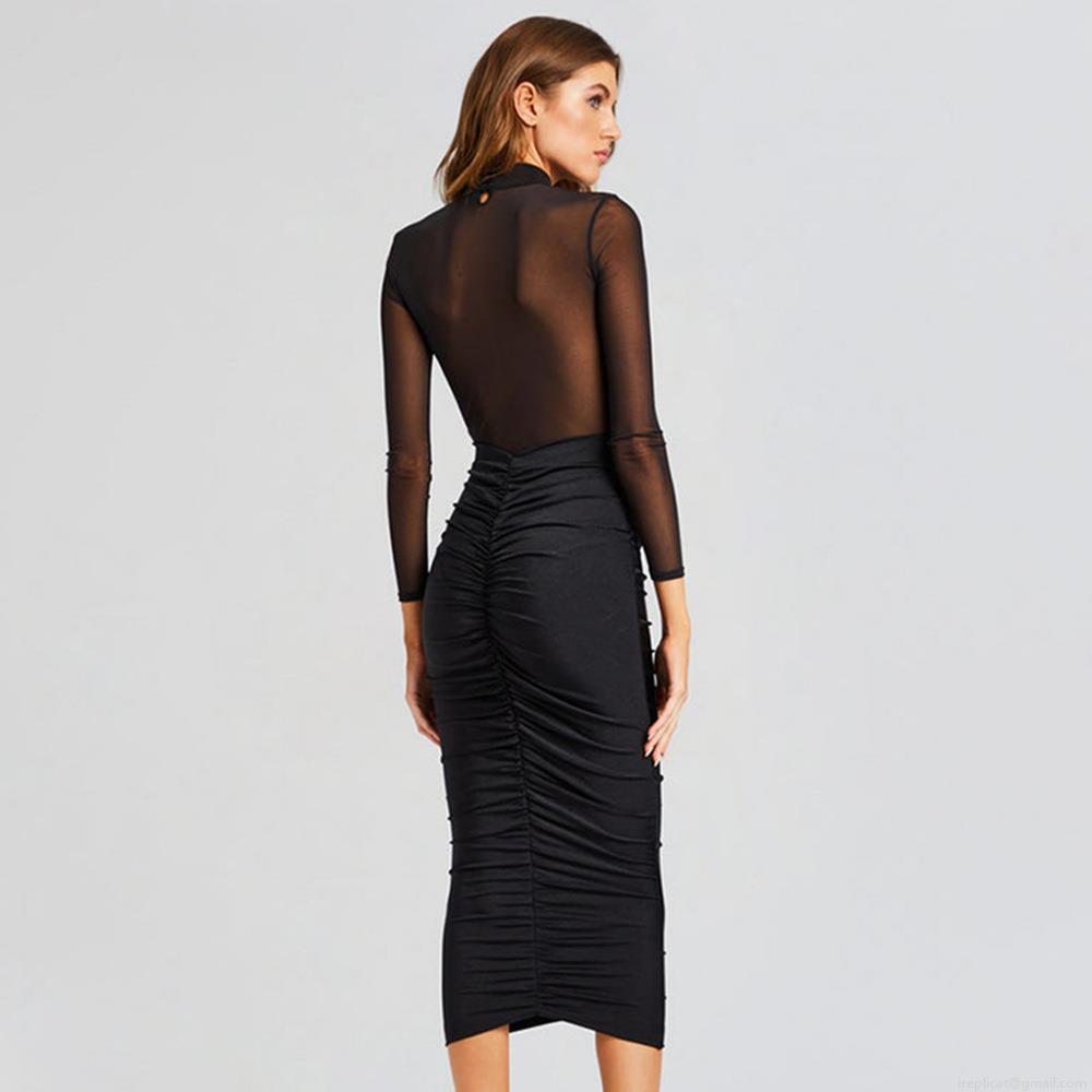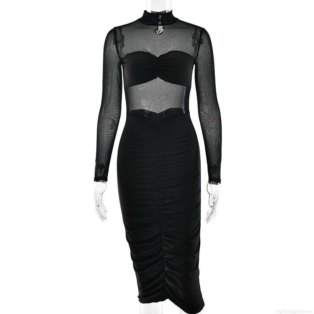 Women Sexy Mesh See-through Ruched Bodycon Midi Dress Long Sleeve Milk Silk Gauze Patchwork High Waist Slim Fit Elegant Evening Party Clubwear Gown