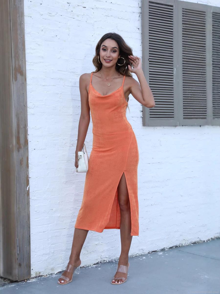 • Women Sexy Orange Cowl Neck Cami Dress Sleeveless Backless High Slit Midi Dress Solid Color Knitted Bodycon Dress for Party Vacation Dating Women Clothing