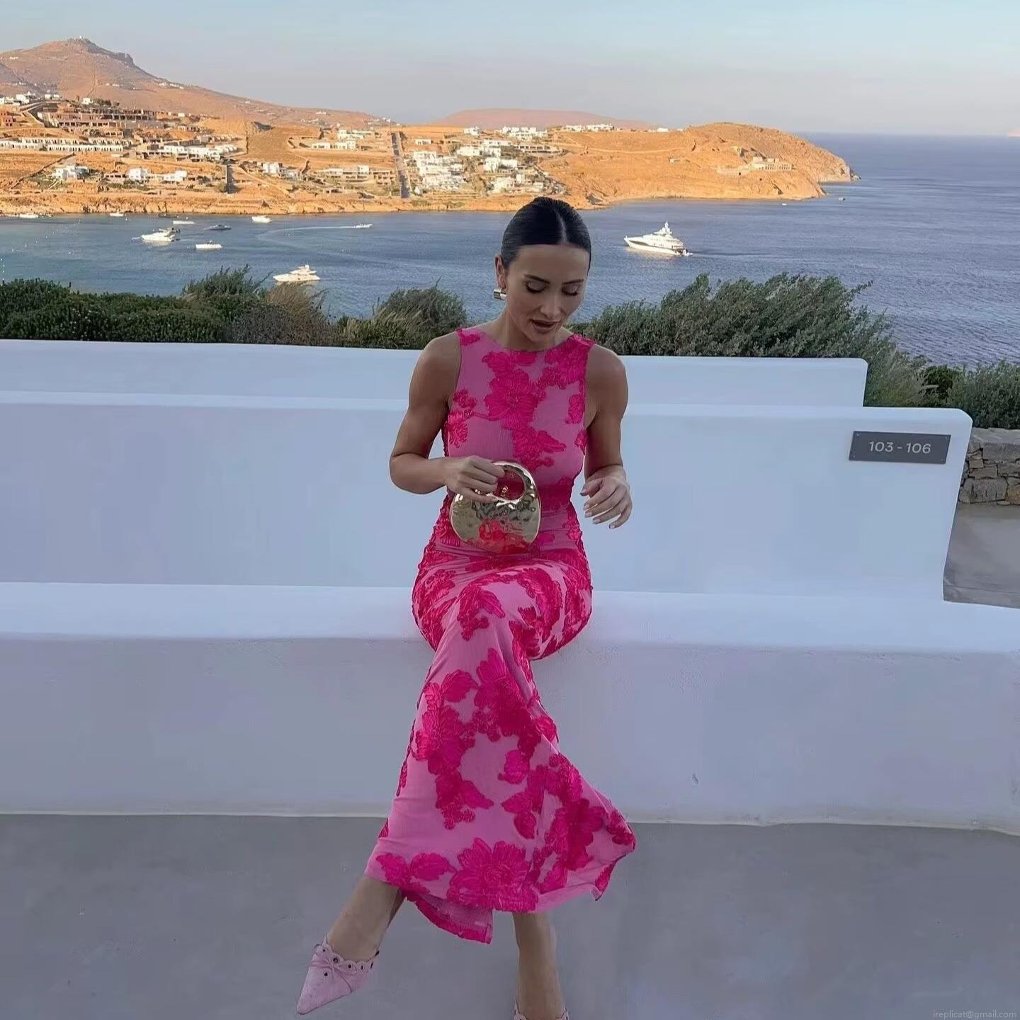 Women Sexy Pink Mesh Midi Dress Elegant 3D Floral Embroidery Spaghetti Strap Bodycon Party Evening Gown Sleeveless Slim Fit Summer Dress