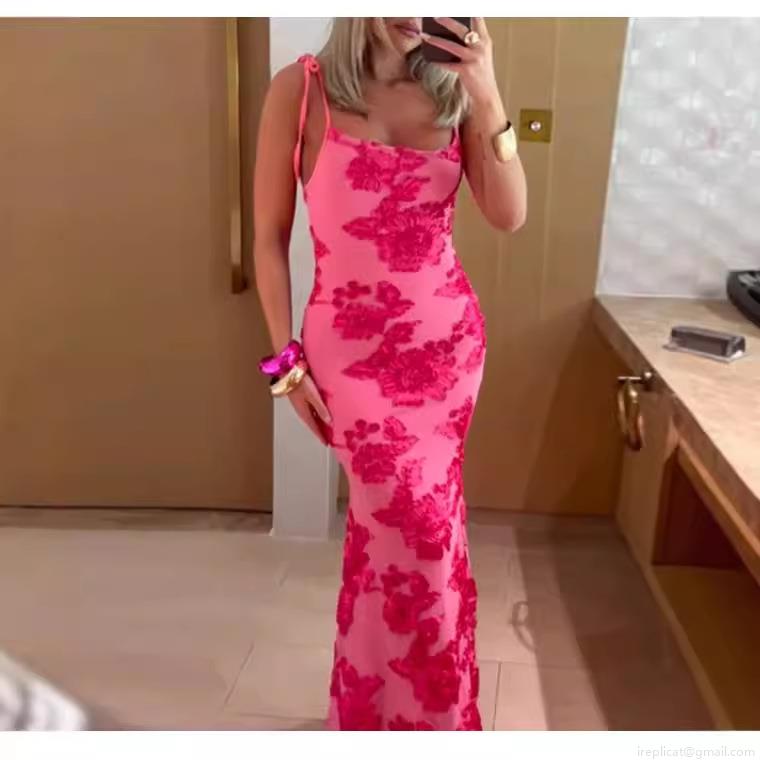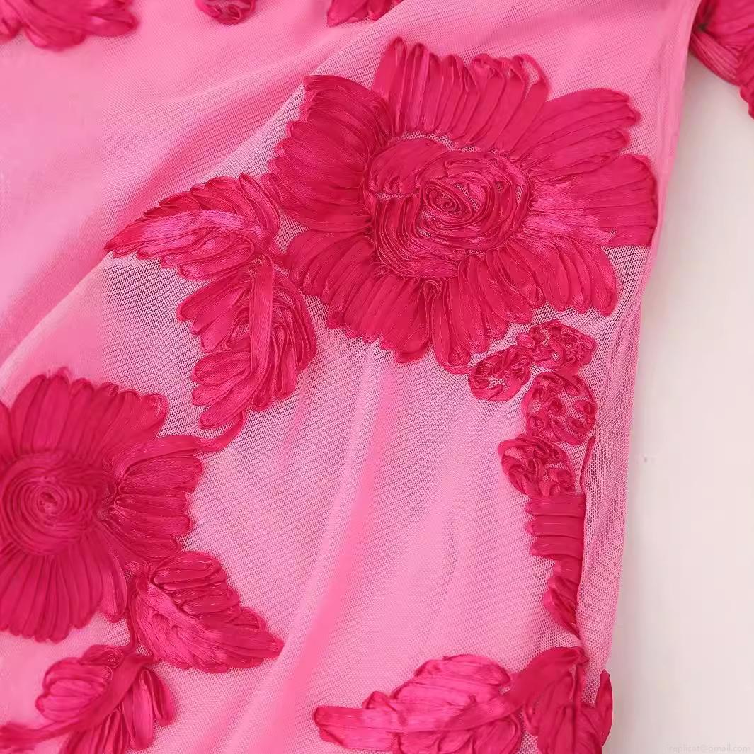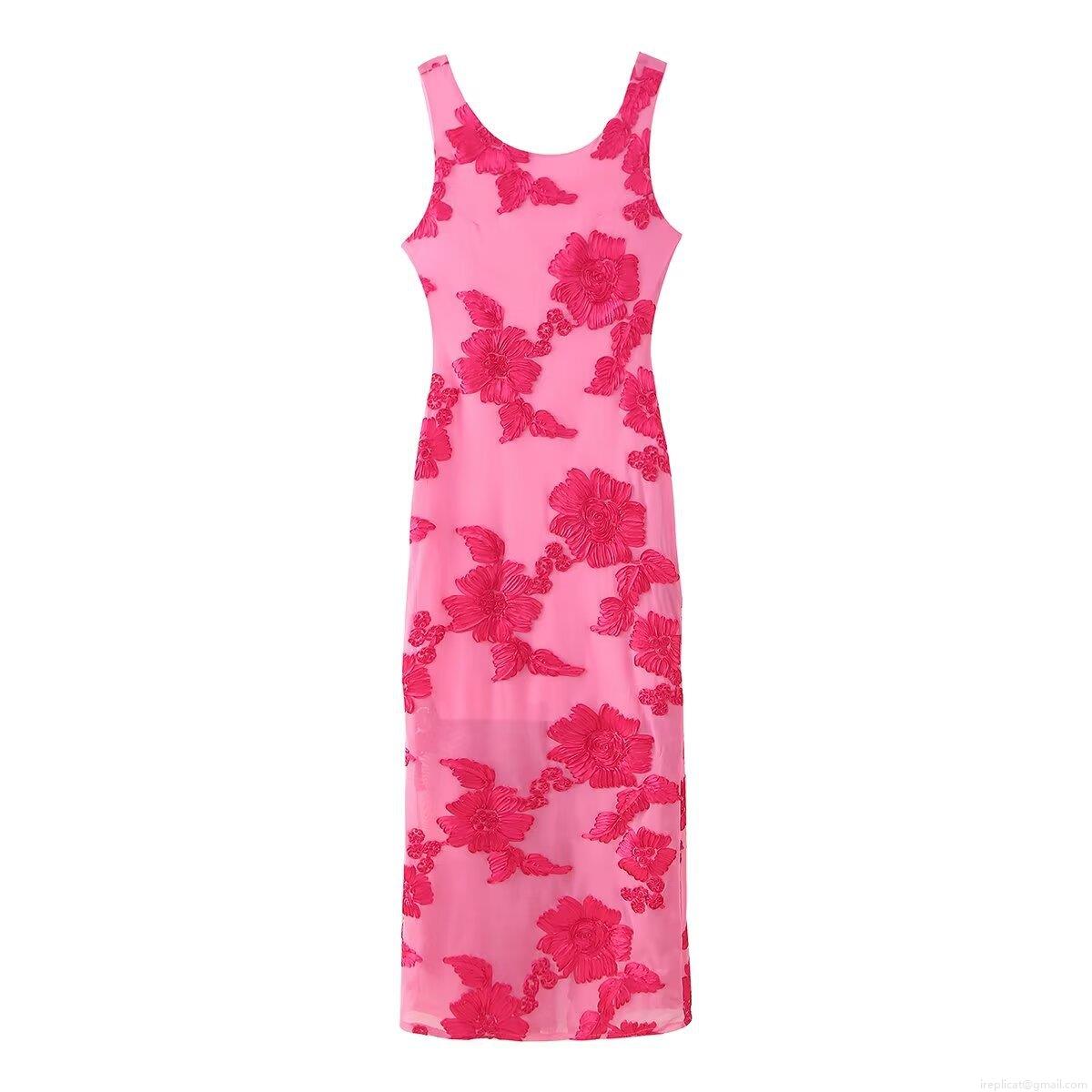 • Women Sexy Pink Mesh Midi Dress Elegant 3D Floral Embroidery Spaghetti Strap Bodycon Party Evening Gown Sleeveless Slim Fit Summer Dress