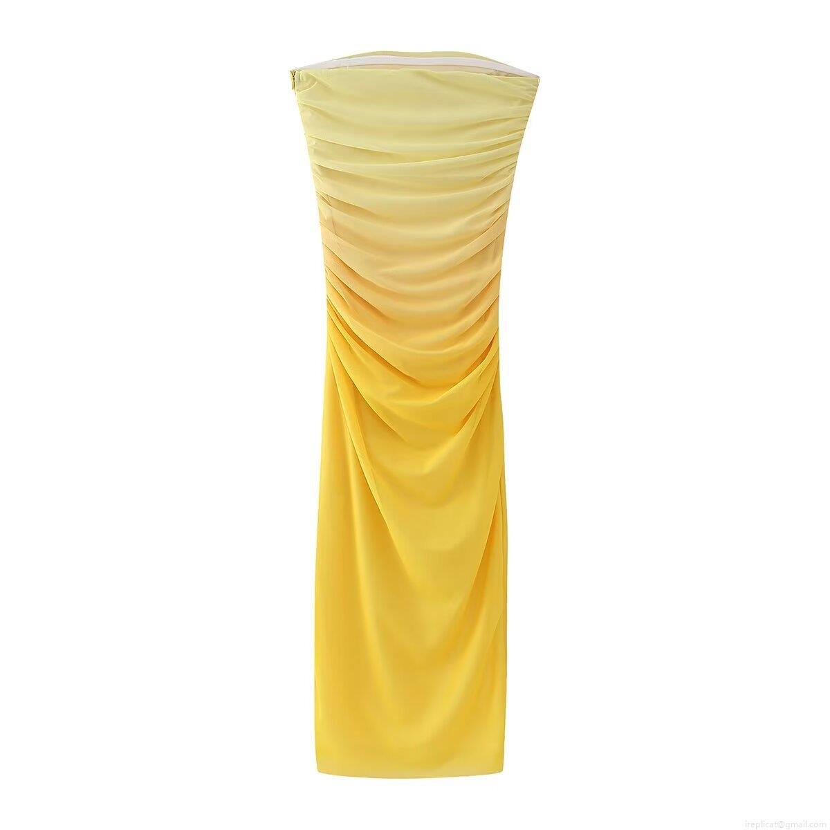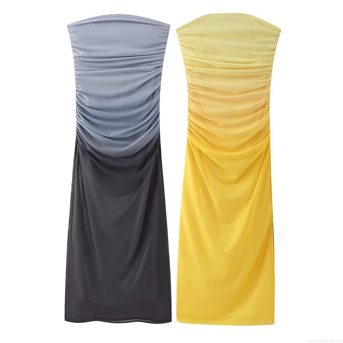 Women Sexy Ruched Ombre Tube Top Midi Dress Strapless Mesh Bodycon Gradient Party Dress Sleeveless Clubwear For Ladies