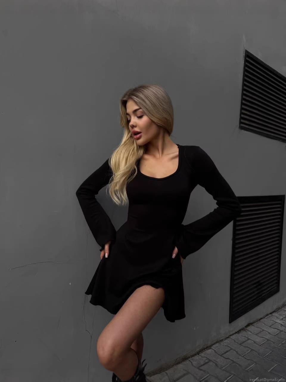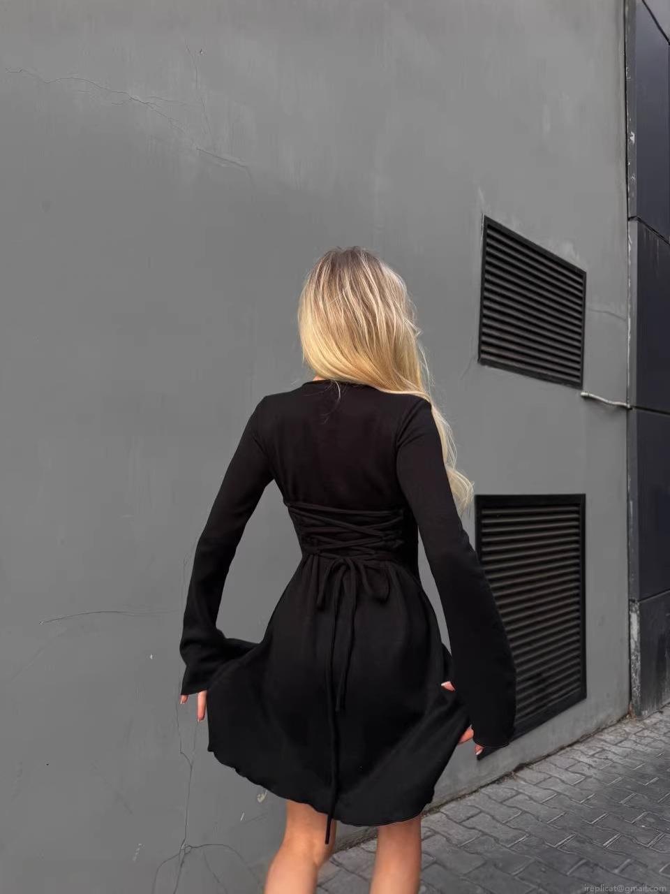 • Women Sexy U-Neck Knitted Cotton Blend Bodycon Midi Dress Backless Drawstring Long Flare Sleeve Solid Color Streetwear Slim Fit Clubwear Skirt