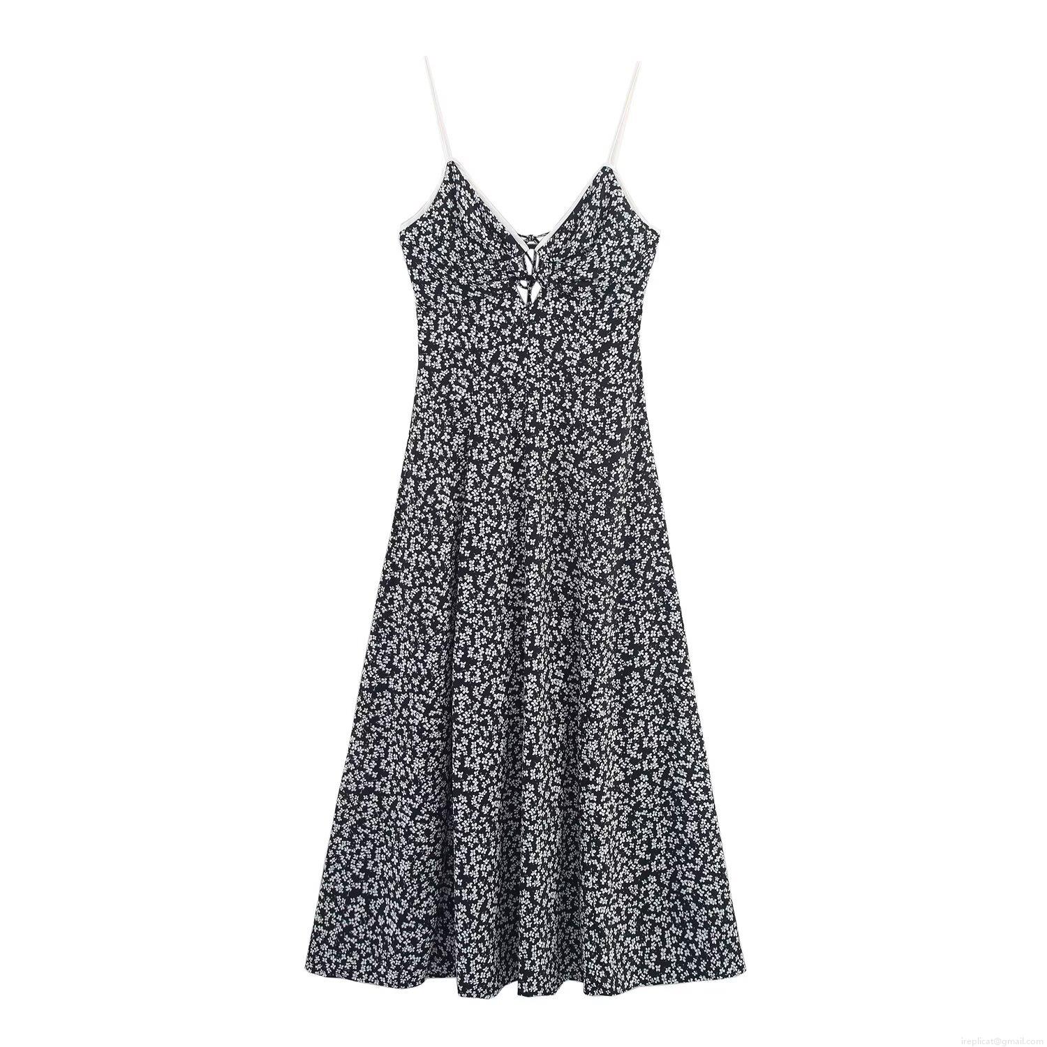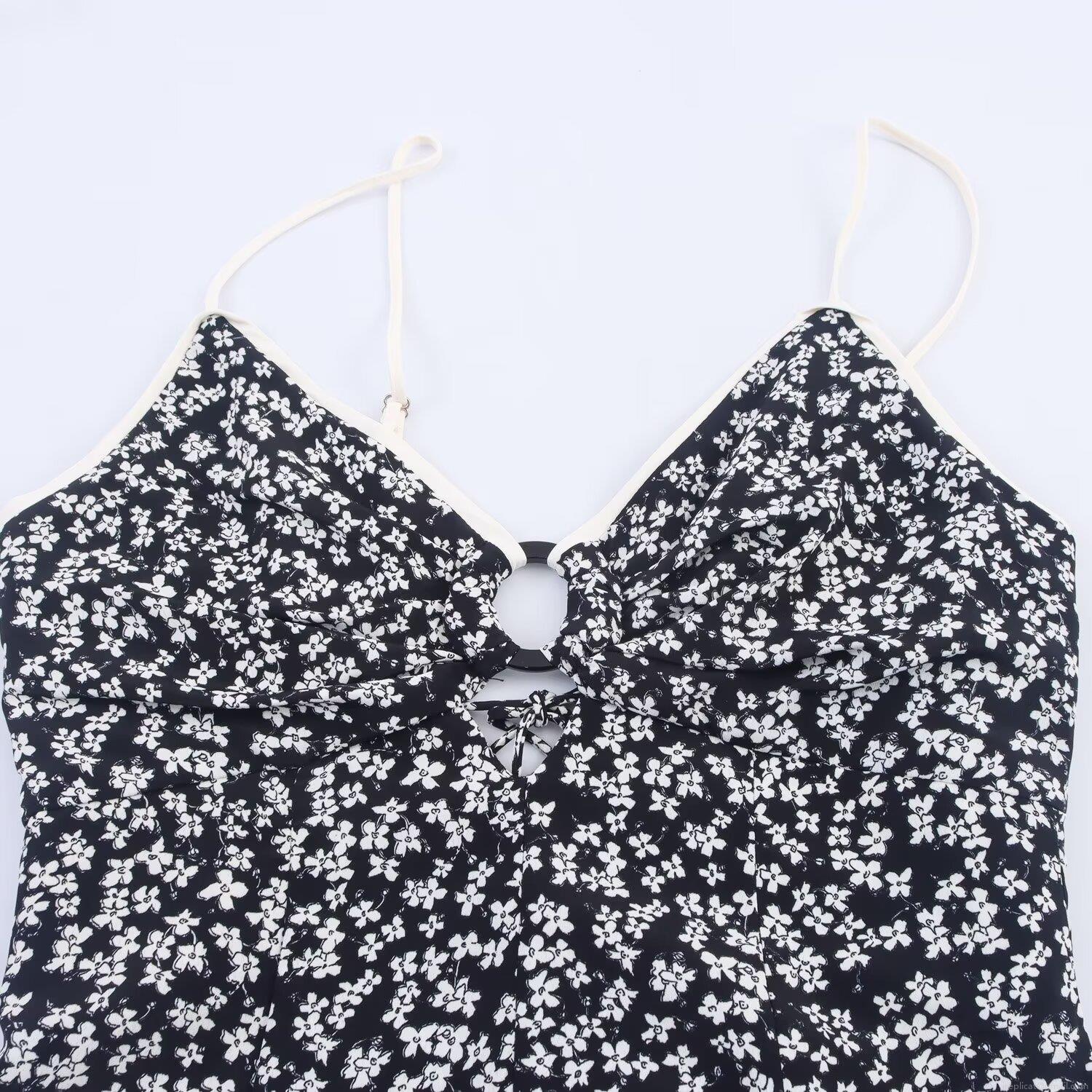 Floral Pattern, V-neck, Thin Shoulder Straps, Lace-up Decoration