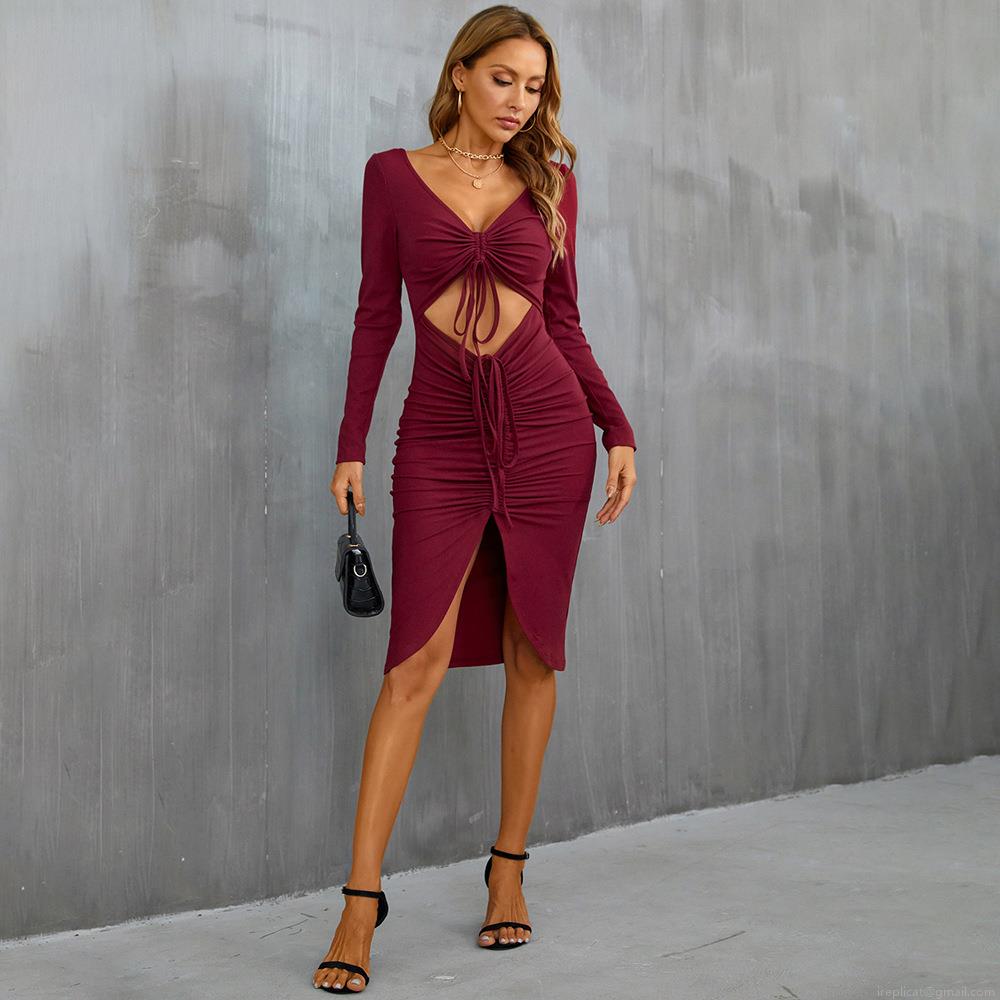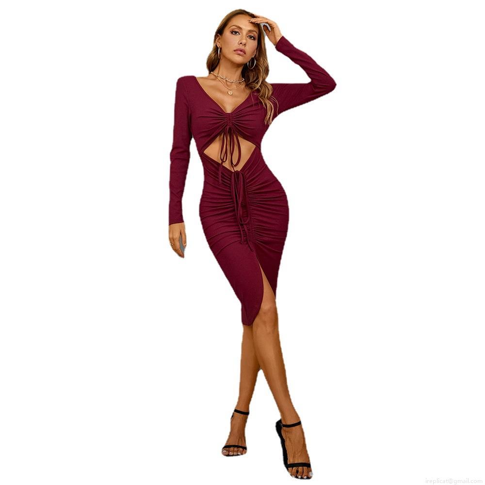 • Women Sexy V-Neck Ribbed Knit Long Sleeve Dress Cutout Drawstring Ruched Side Slit Midi Bodycon Dress Rayon Polyester Spandex Evening Party Dress