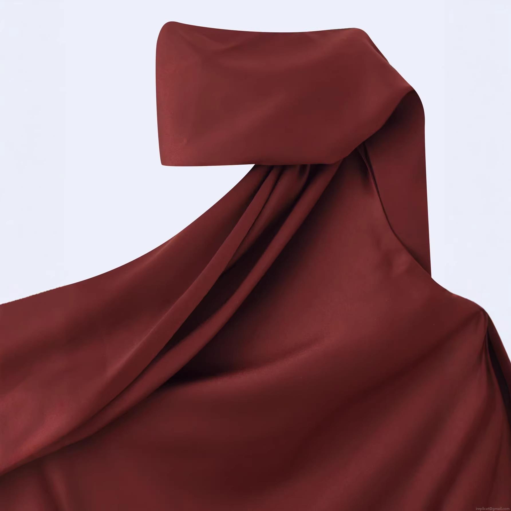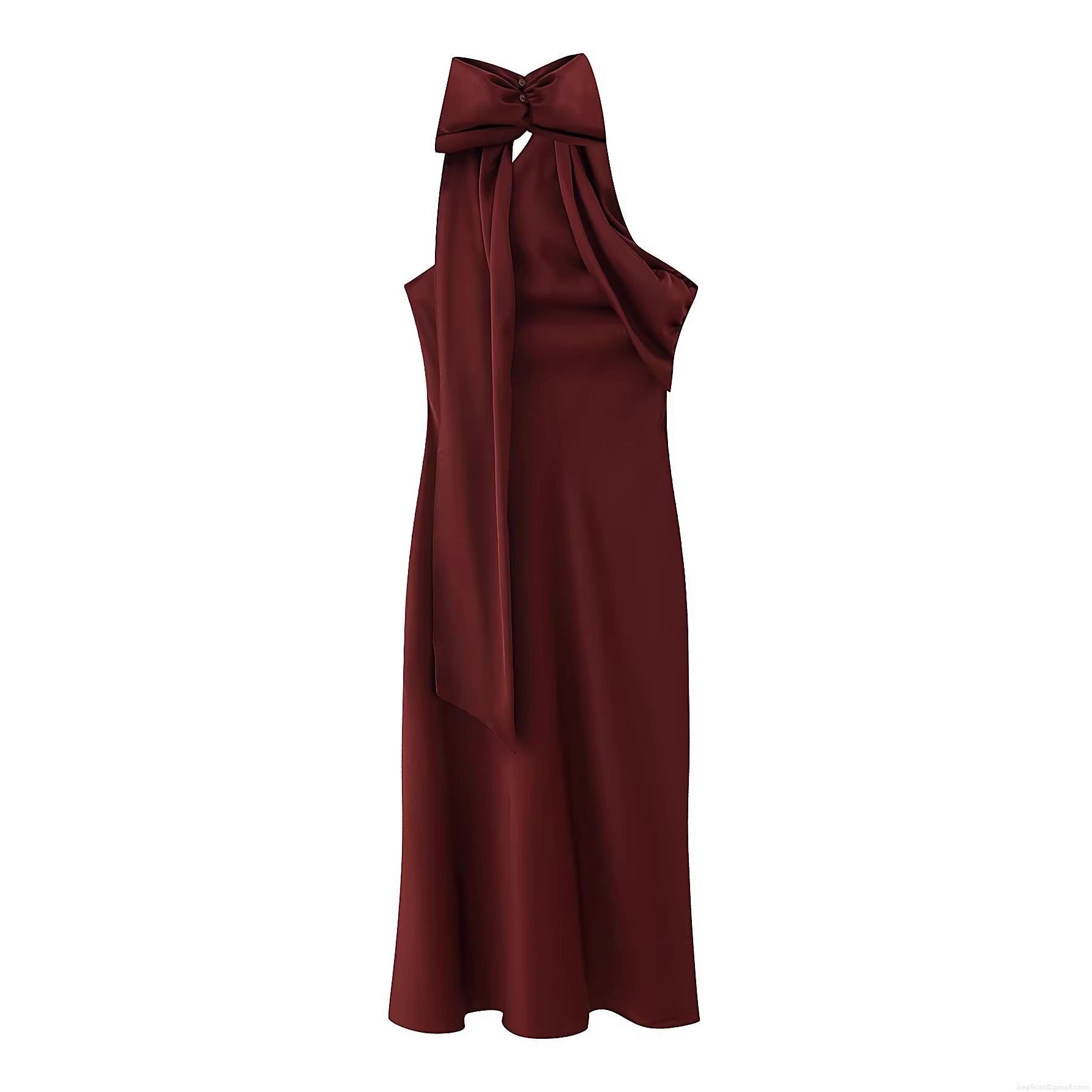 • Women Sexy Wine Red Satin Midi Dress Asymmetric Scarf Neck Sleeveless Bow Pleated Elegant Evening Party Dress Socialite Celebrity Style Gown