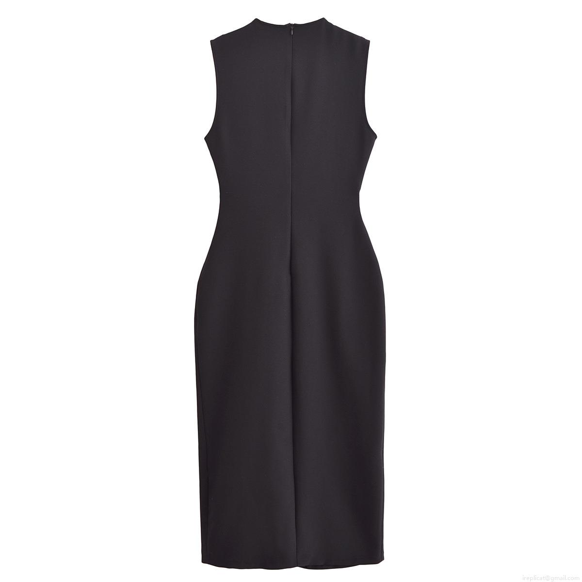 • Women Sleeveless Midi Dress With Belt Gold Button Decoration Round Neck Solid Color Polyester Bodycon Dress For Office Party Daily Wear