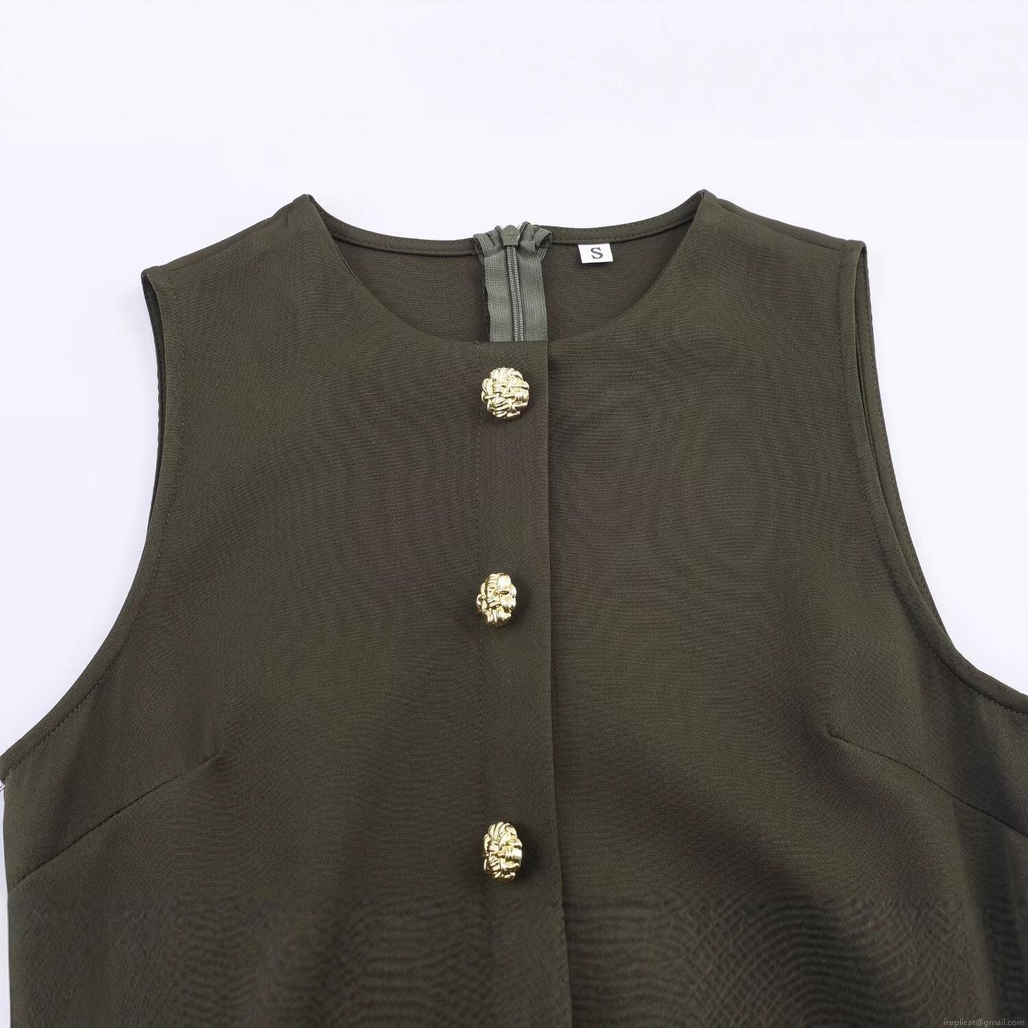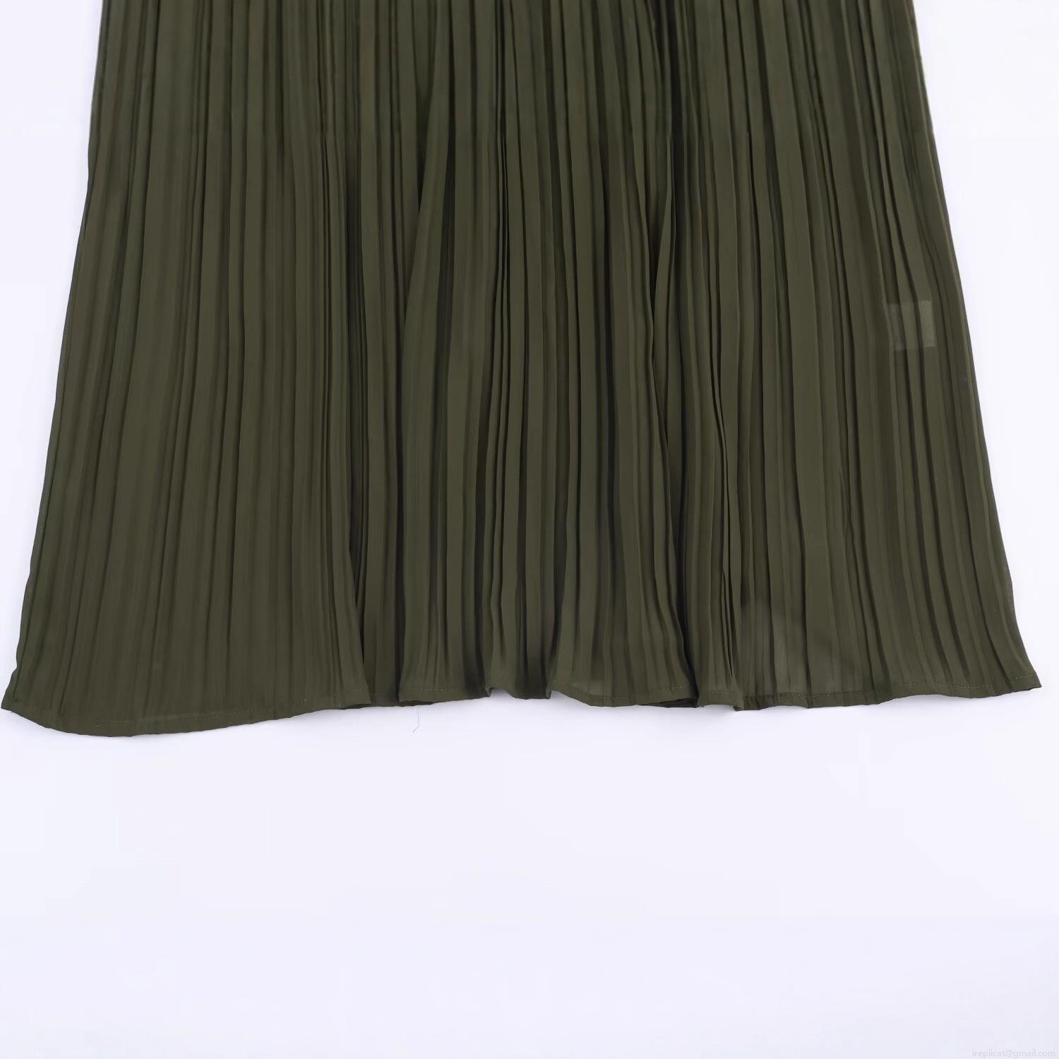 • Women Sleeveless Pleated Midi Dress With Belt Elegant Olive Green Patchwork Round Neck Single Breasted Long Dress Casual Streetwear Apparel