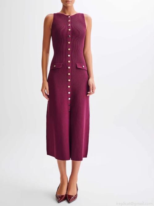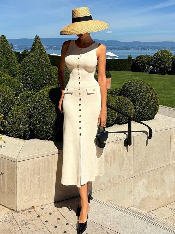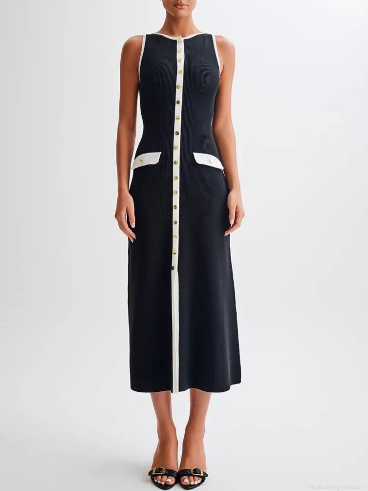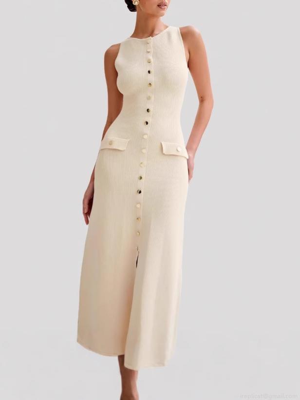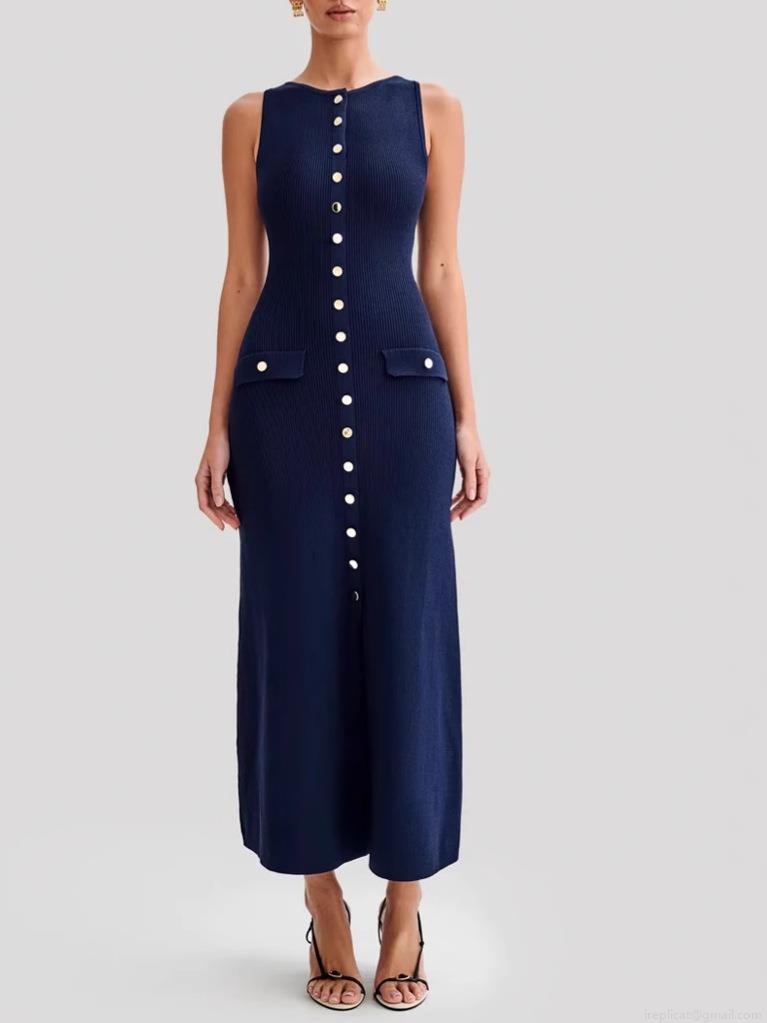 • Women Sleeveless Ribbed Knit Maxi Dress Slim Fit Single Breasted Button Front Bodycon Long Dress With Decorative Pockets Sexy Commuter Summer Party Dress