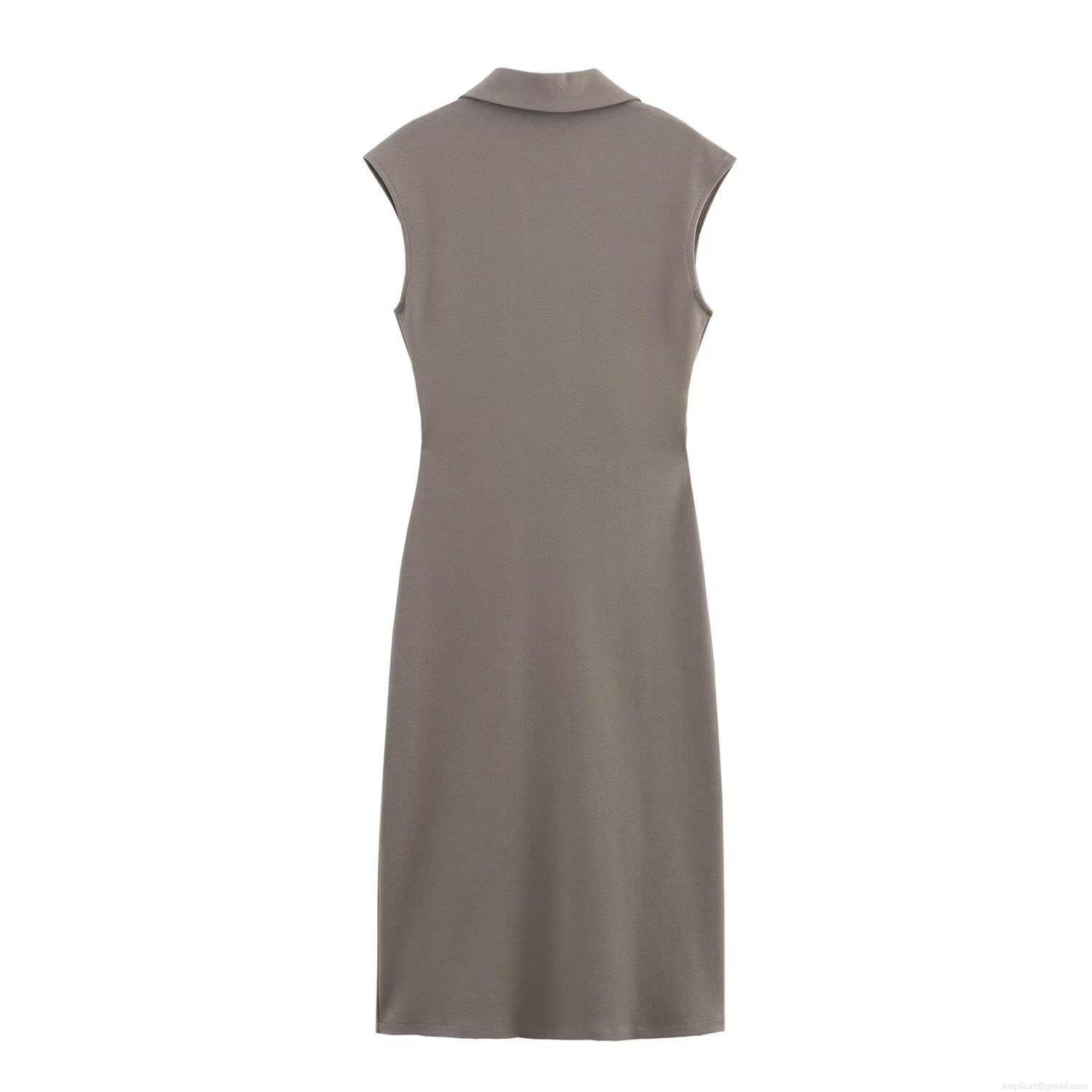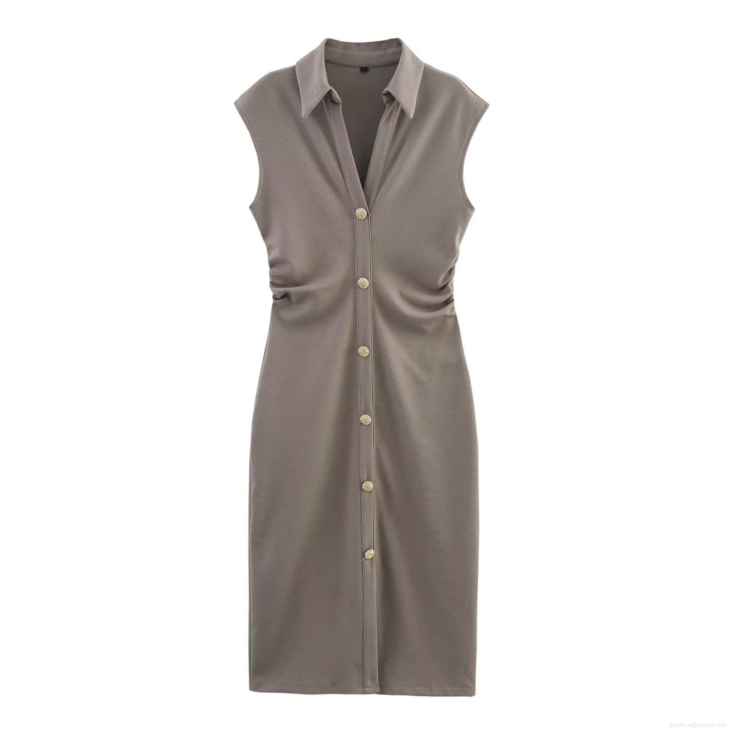 • Women Sleeveless Shirt Midi Dress Cotton Blend Ribbed Knit Elegant V-Neck Gold Buttons Pleated Slim Waist Solid Color Summer Casual Office Party Dress